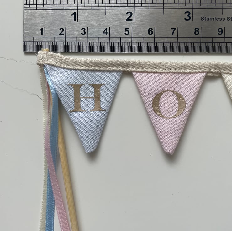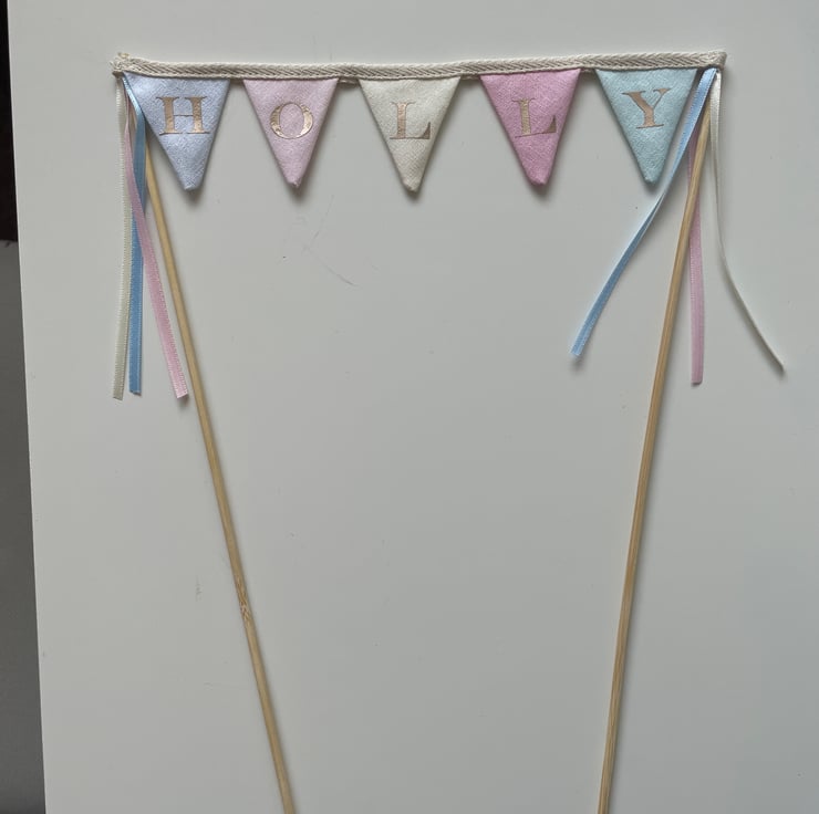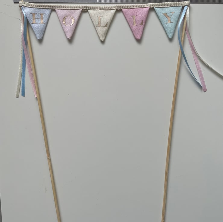 Reusable Pastel rainbow fabric bunting cake topper, perfect for all occasions. Can be personalised with a name ideally 7 max letters . For smaller name with four or less a plain flag can be placed on each side. Rainbow as standard put please let me know if you would prefer one specific colour out of their rainbow colours shown.