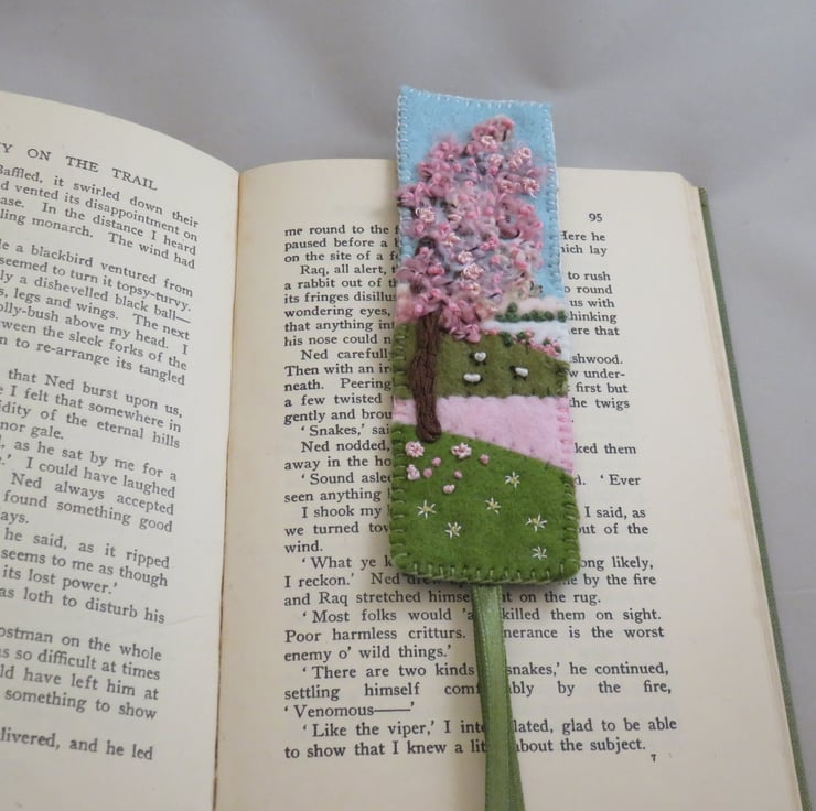 A cloud of pink blossom and some very tiny sheep feature on this pretty spring-time felt bookmark.