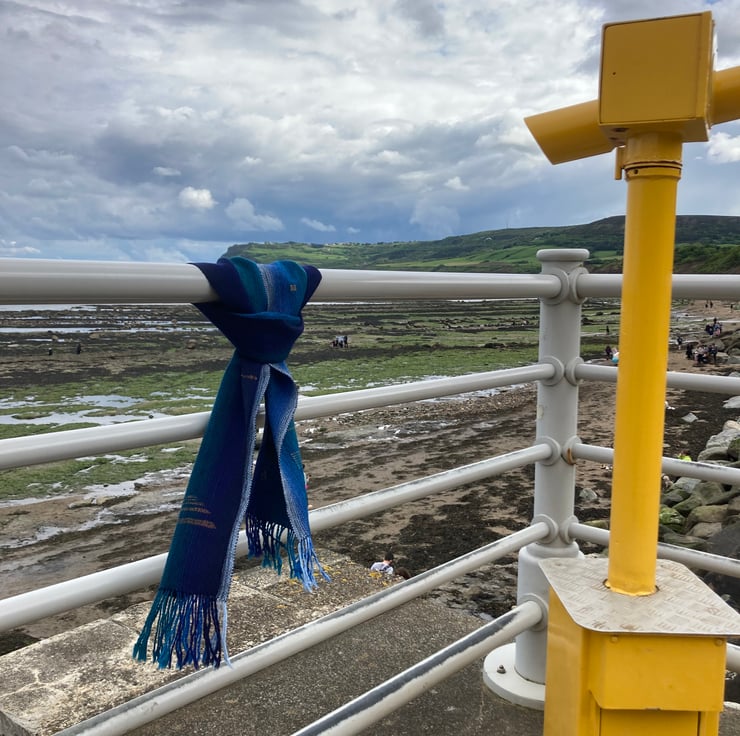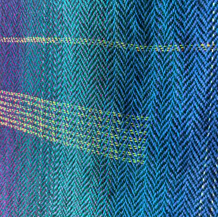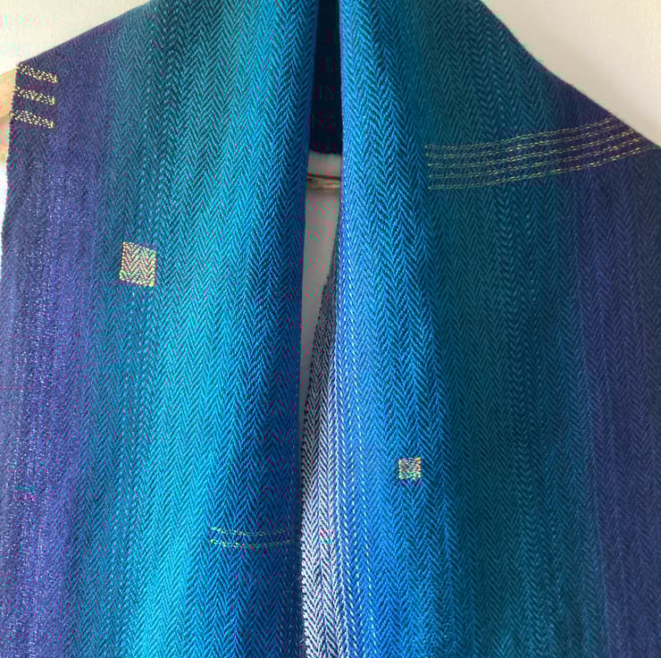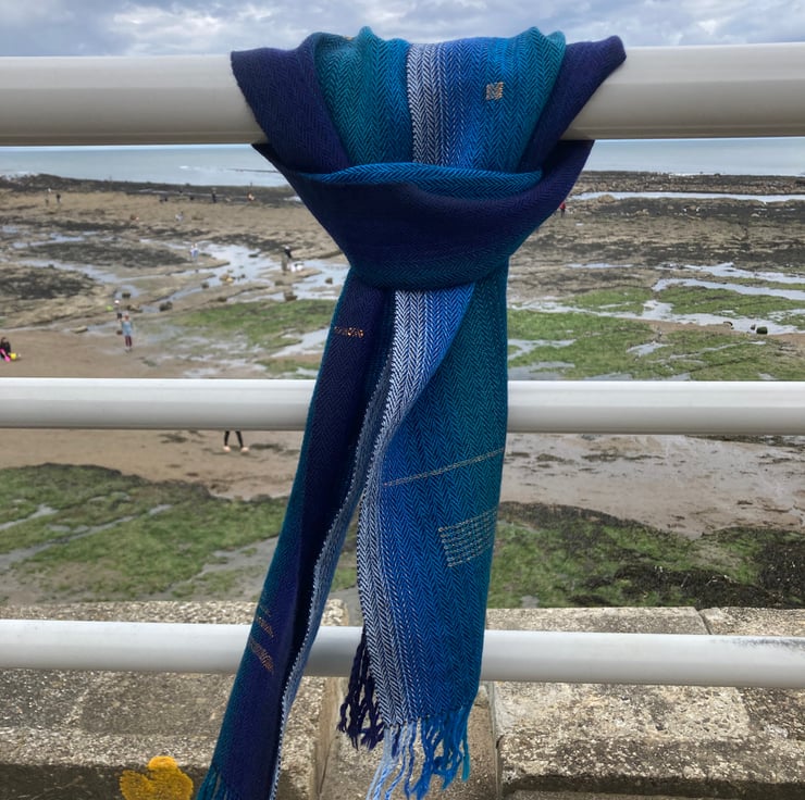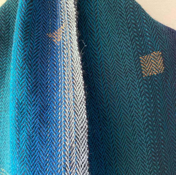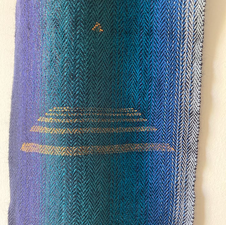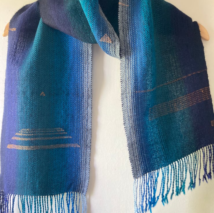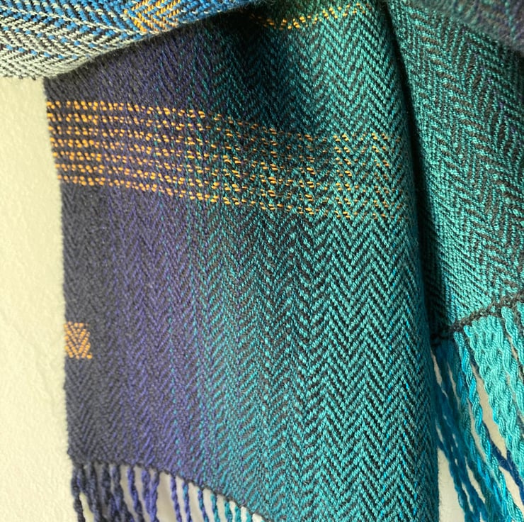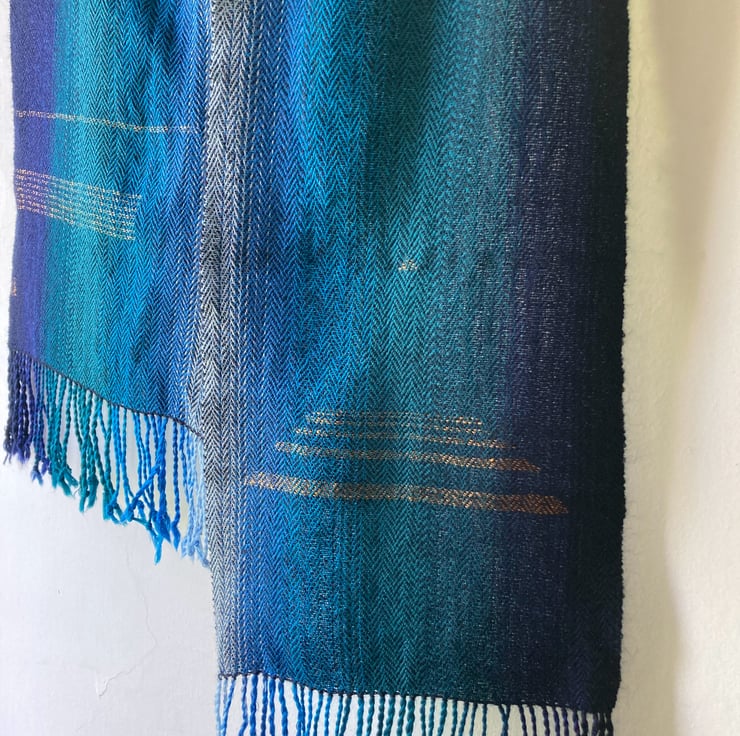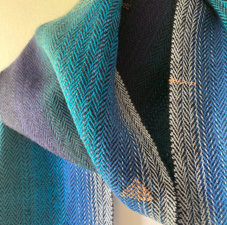 Handwoven in very fine merino, with an 8 colour gradient warp and deep navy weft. This scarf has a touch of the nautical. Woven in a simple 8 shaft herringbone draft to set off the gentle sheen and the deep gradient from light to dark tones of blue and turquoise. Inlaid with very fine orange silk, hinting at the harbour lights and the streetlights reflected in the harbour, and the iconic swing bridge. Woven from merino, with a beautiful supple drape, it will regulate your temperature and won’t be itchy or prickly- a scarf for all seasons.