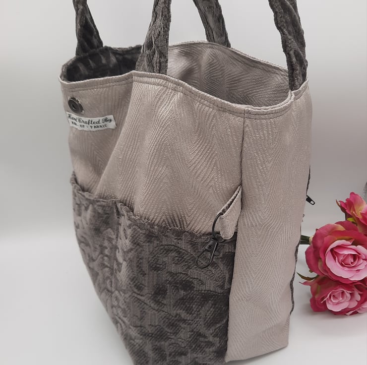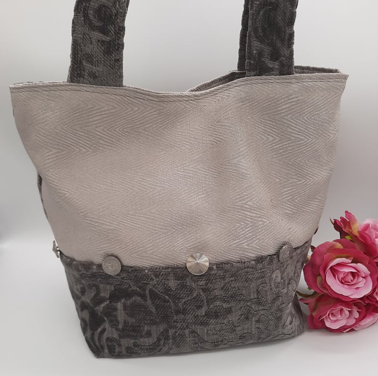 Silver and Ash grey chenille handbag with decorative buttons across the front.