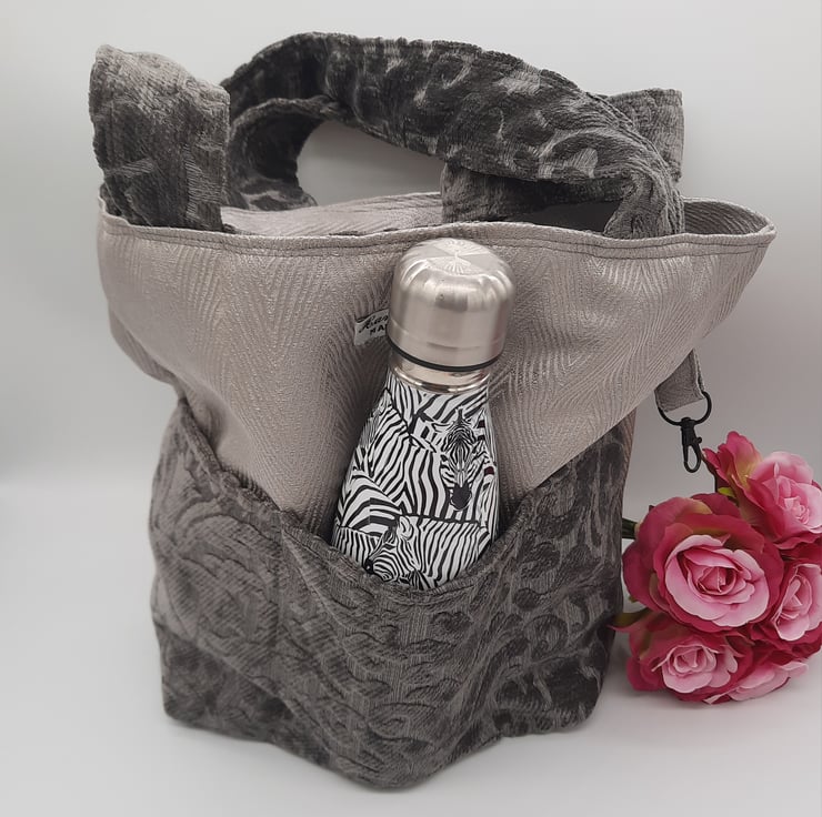 The bag is fully lined and has inside pockets. 3 of the pockets are open and can hold a water bottle as shown in the photos. It also has a large zipped pocket and a swivel claw hook for attaching your keys.