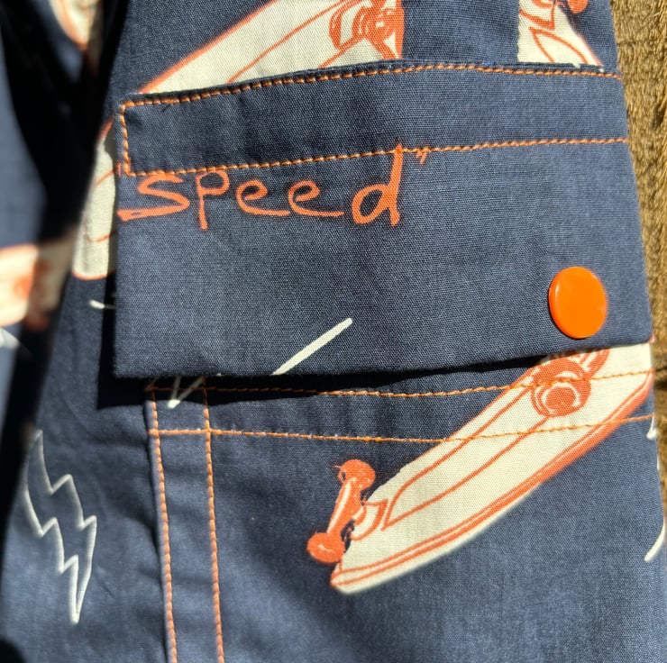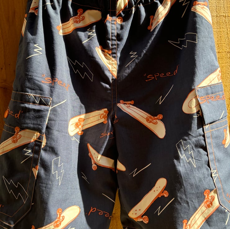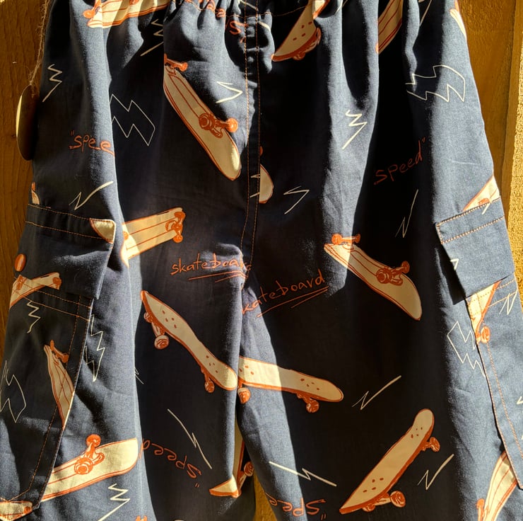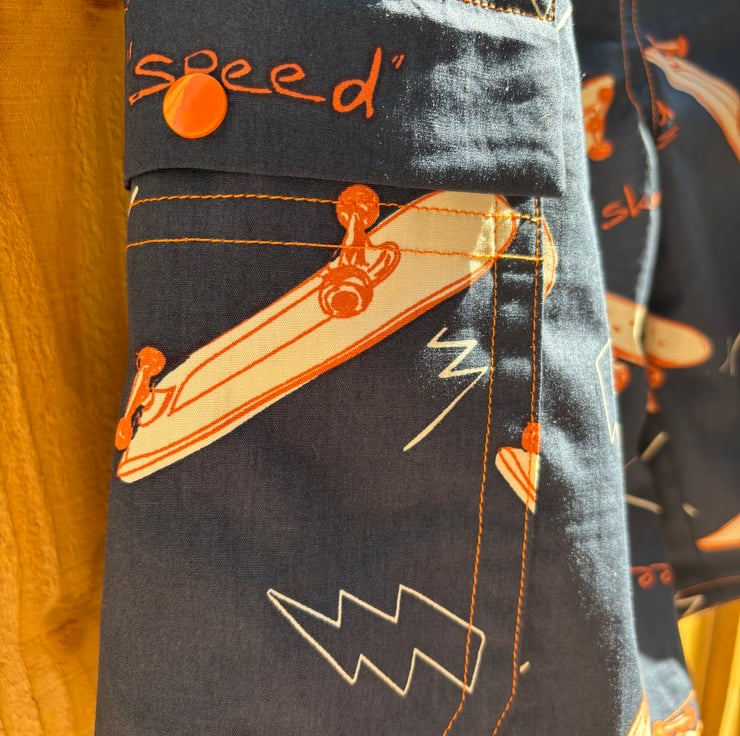 These navy shorts are made in a cargo style with side leg pockets on each side. The shorts feature skateboards and some writing about the activity. The orange accents are bought out by orange topstitching and orange poppers on the pocket fasteners.