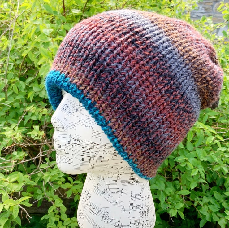 A very cosy hat that would be perfect for winter as it's so thick and warm. It has been knitted in a very soft chunky yarn, with shades of blue on one side (100% Acrylic) and shades of brown to the other (100% Acrylic).