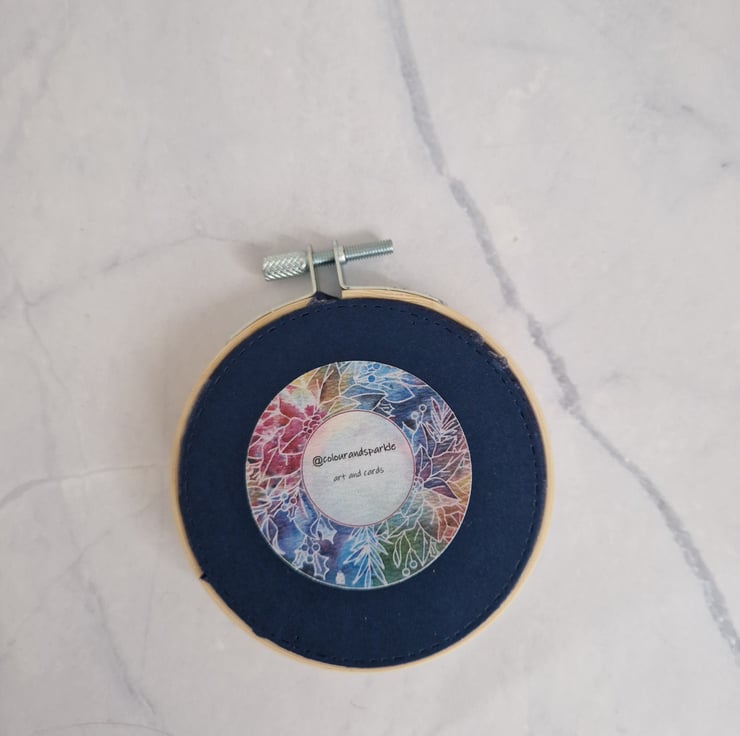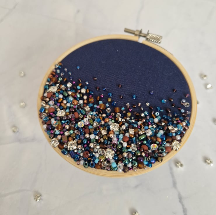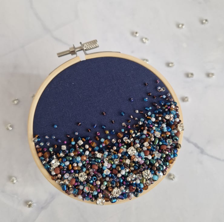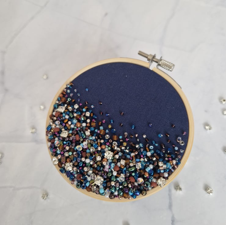 A delicate handmade beaded embroidery hoop, made with navy cotton cloth scattered with beads and crystals of various sizes, which catch the light beautifully.