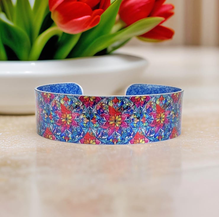 This is a cuff bracelet which I have handmade with a colourful mandala design in a red and blue. This bracelet can be engraved with a personal message on the reverse for a small extra fee (Optional). Matching earrings and pendant are available.