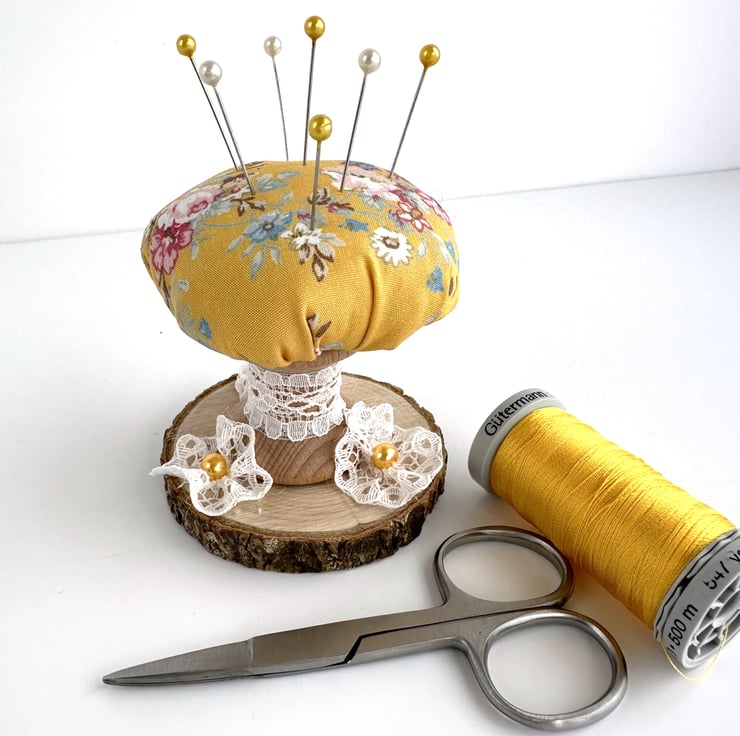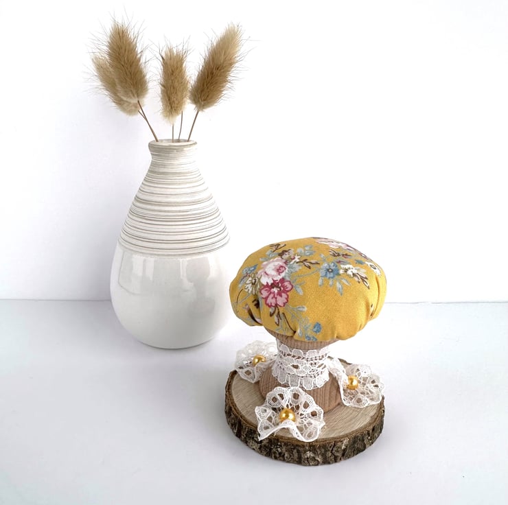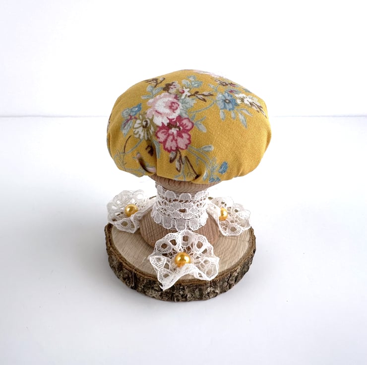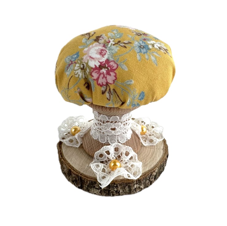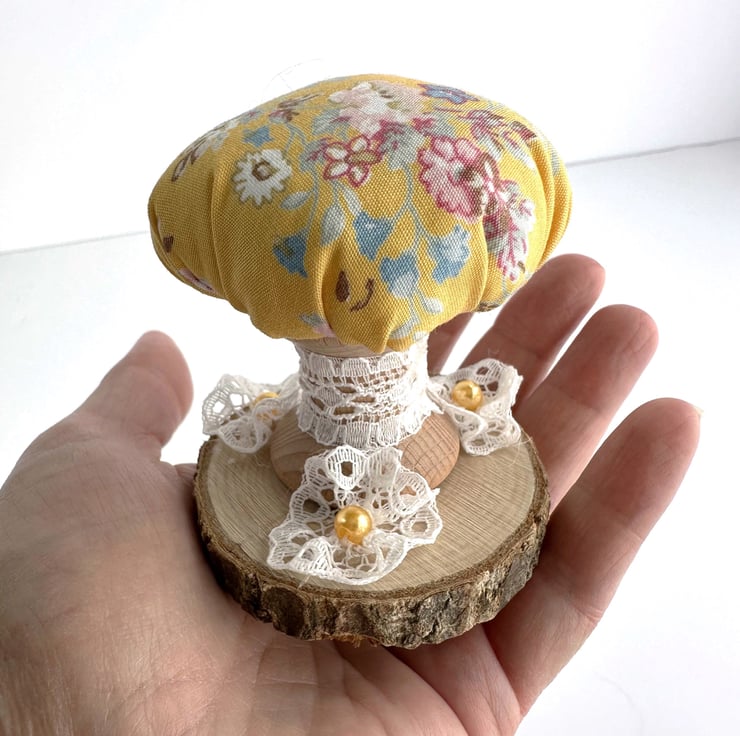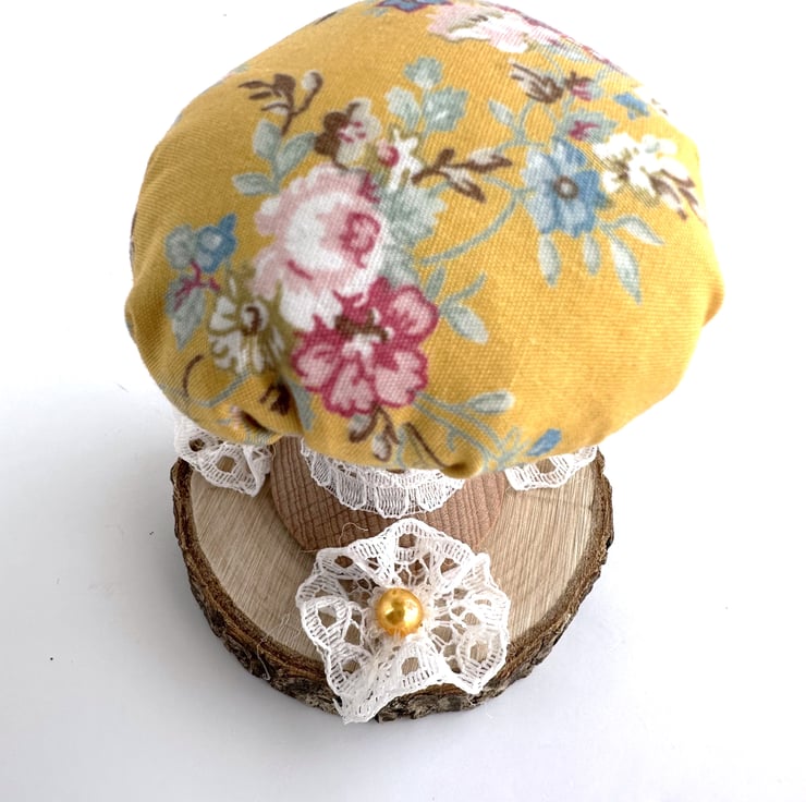 Floral mushroom pin cushion with pastel flowers. This delightful pin cushion consists of a wooden cotton reel and fabric toadstool, mounted on a log slice along with three handmade lace flowers. The mushroom top is made from gorgeous yellow cotton with a floral print pattern in pastel shades of pink, pale blue, pale green, white and brown. It is stuffed with polyester hollow fibre filling. The cotton reel stem is wrapped with pretty cream lace. The three flowers that surround the mushroom on the log slice base, are hand made from cream lace with yellow faux pearl centres.