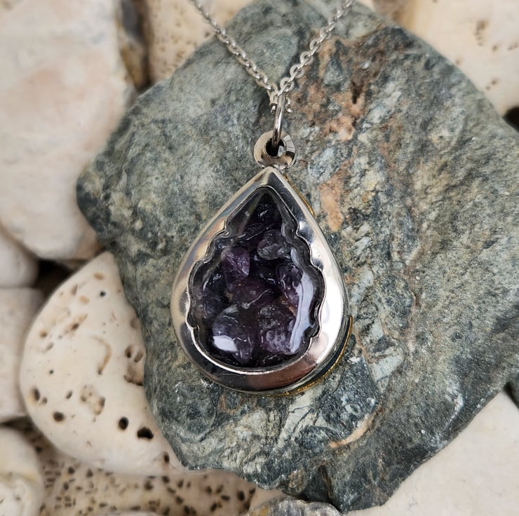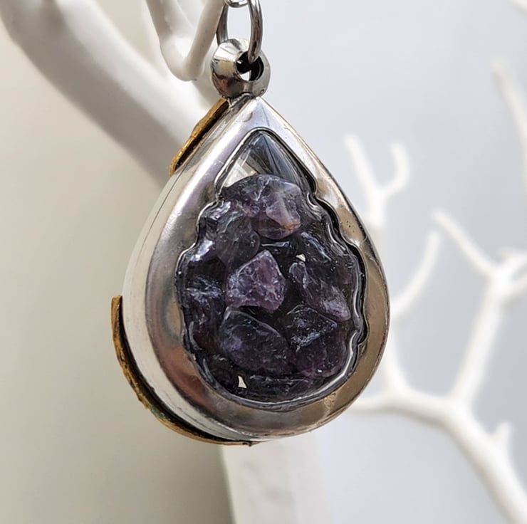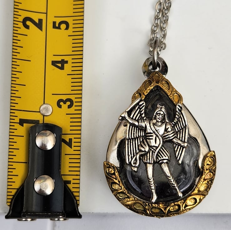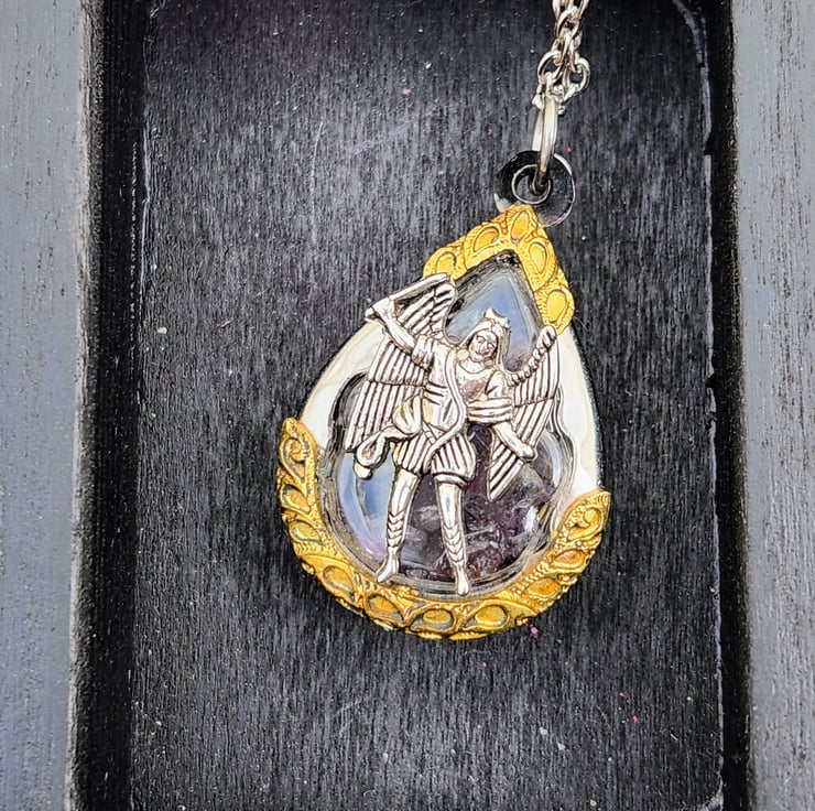 This archangel Michael necklace features Amethyst encased in a stainless steel and acrylic frame.