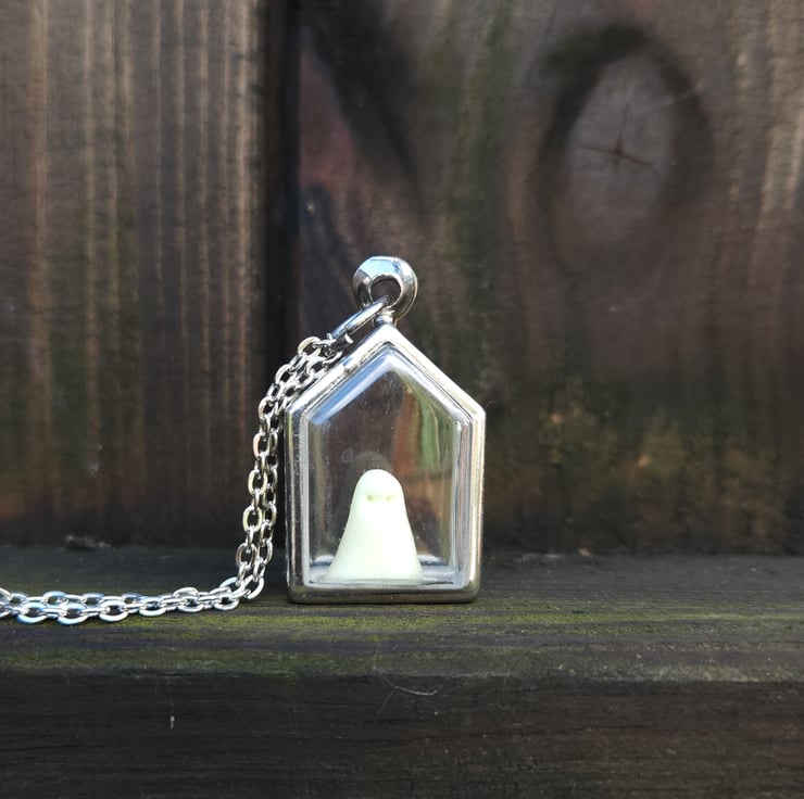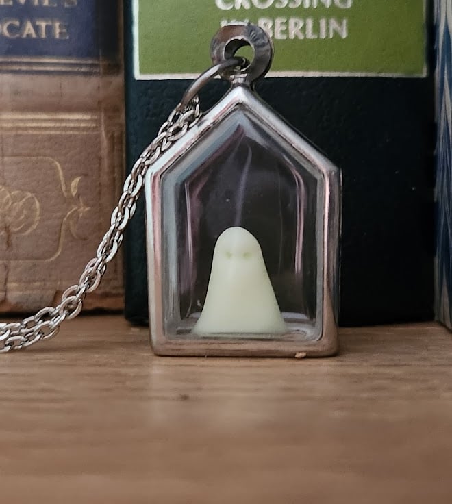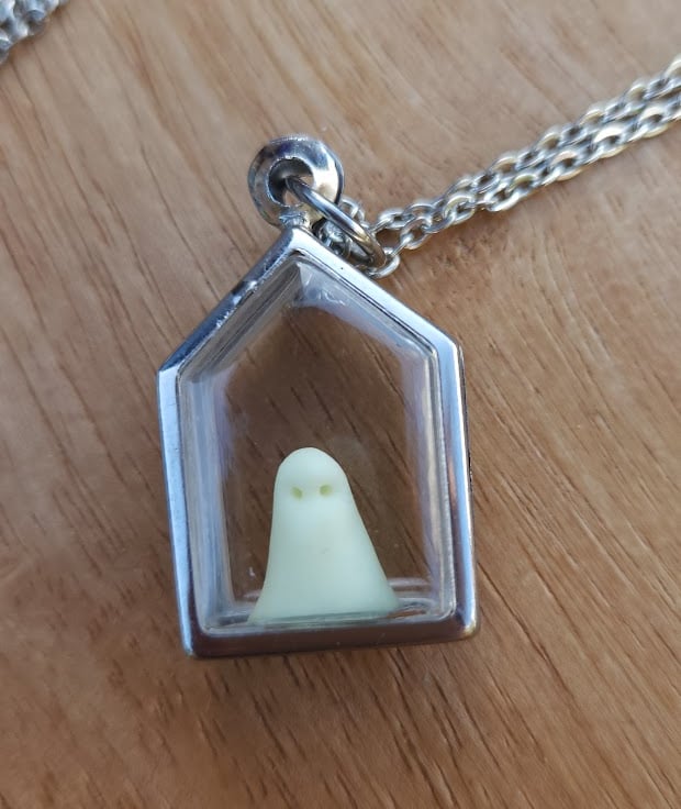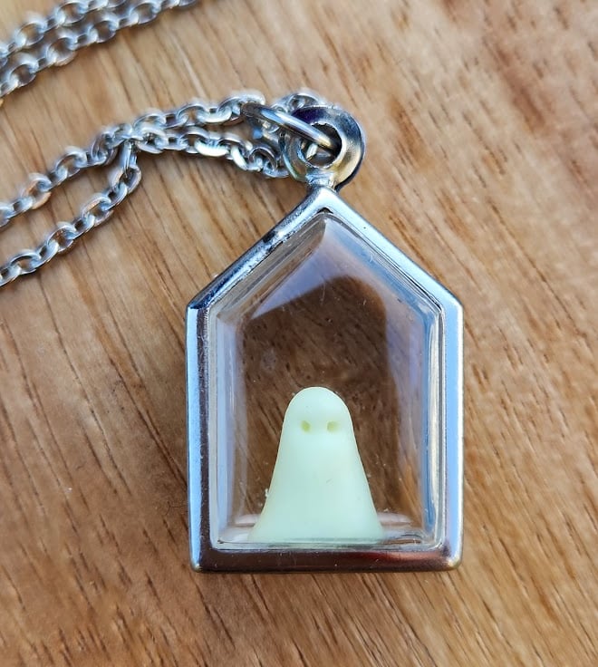 Tiny ghost hand sculpted with glow in the dark polymer clay. Stainless steel pendant casing is not pristine - it is an up cycled piece. Pendant is on an 18" stainless steel chain.
