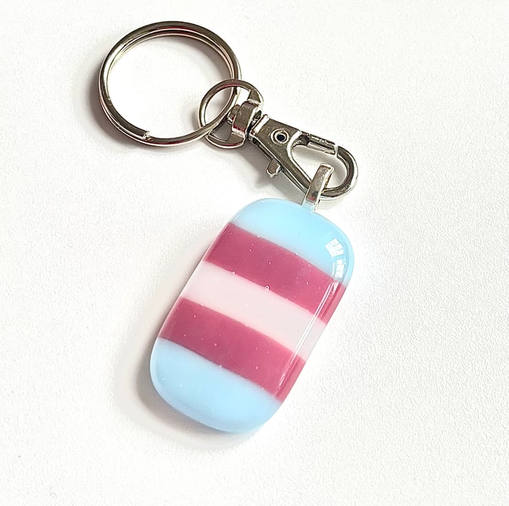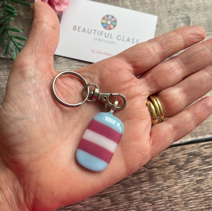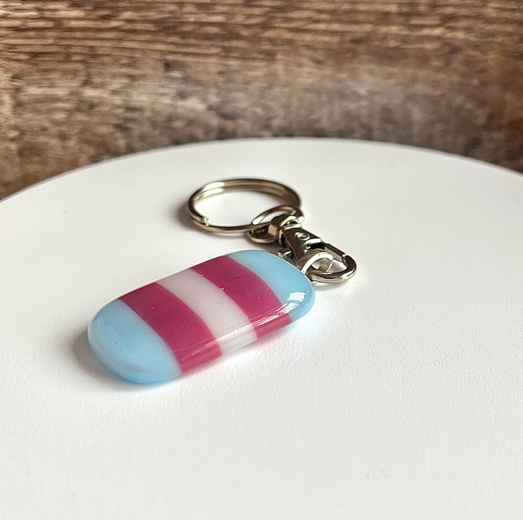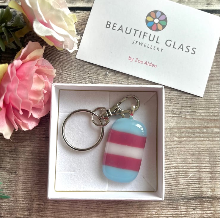 This handmade rainbow keyring would make a beautiful gift. Made by cutting individual strips of pink, white and blue glass and allowing them to fuse together in my kiln to form a beautiful rainbow.