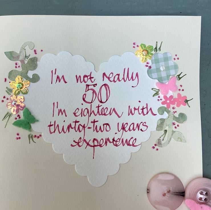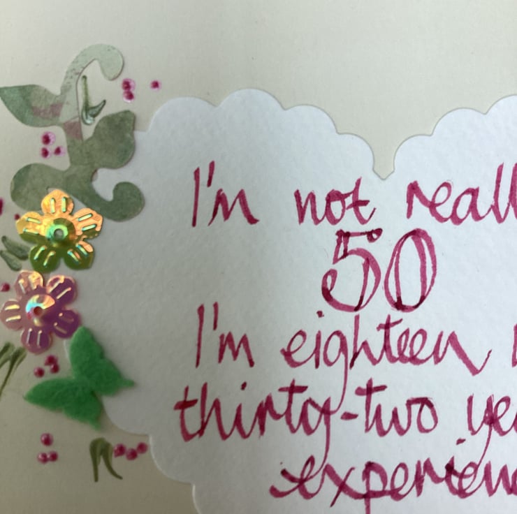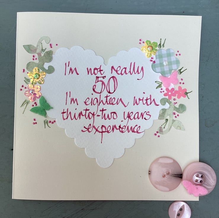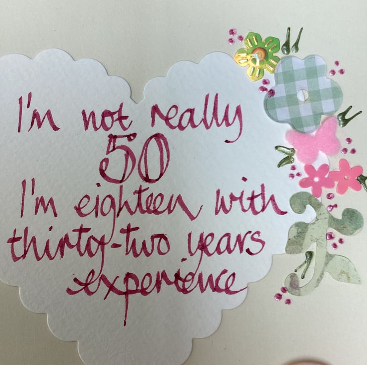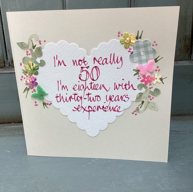 I’m not really 50 ,I’m eighteen with thirty-two years experience.Handmade birthday card.Colours will vary as this is handmade.14cm square.Blank inside.Free postage to Uk.
