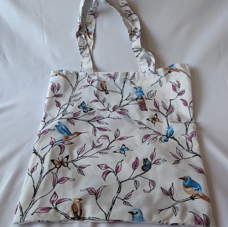 This is a very pretty bird fabric which is a good quality cotton. The bag folds into the pouch attached to the main body of the bag and is handy to leave in the car, handbag or pocket. It is very sturdy and surprisingly spacious and hold several items. This is also personalised please choose between a name or initials and one of the two quips. Please dont forget to let me know your choices when ordering.