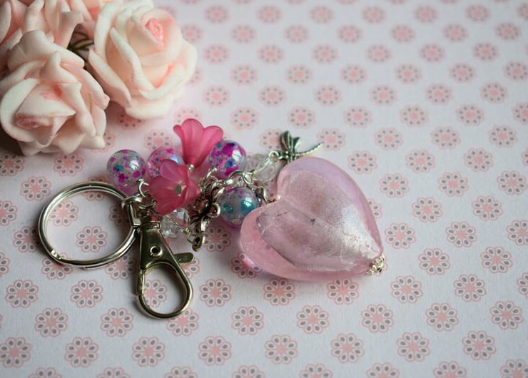 The pink glass heart is at the bottom of a chain beaded with pink and blue glass beads, acrylic flowers, and a flower and dragonfly Tibetan silver charm. There is both a keyring finding and a sturdy snap hook so you can use it as either or both.