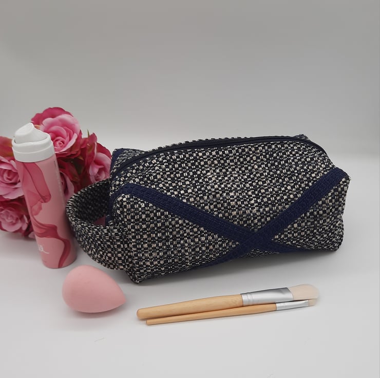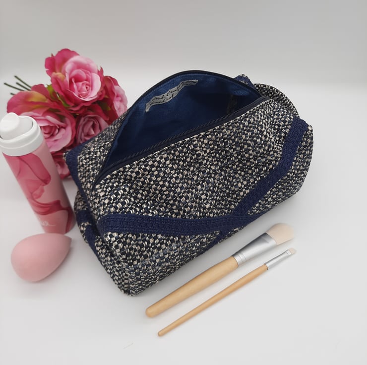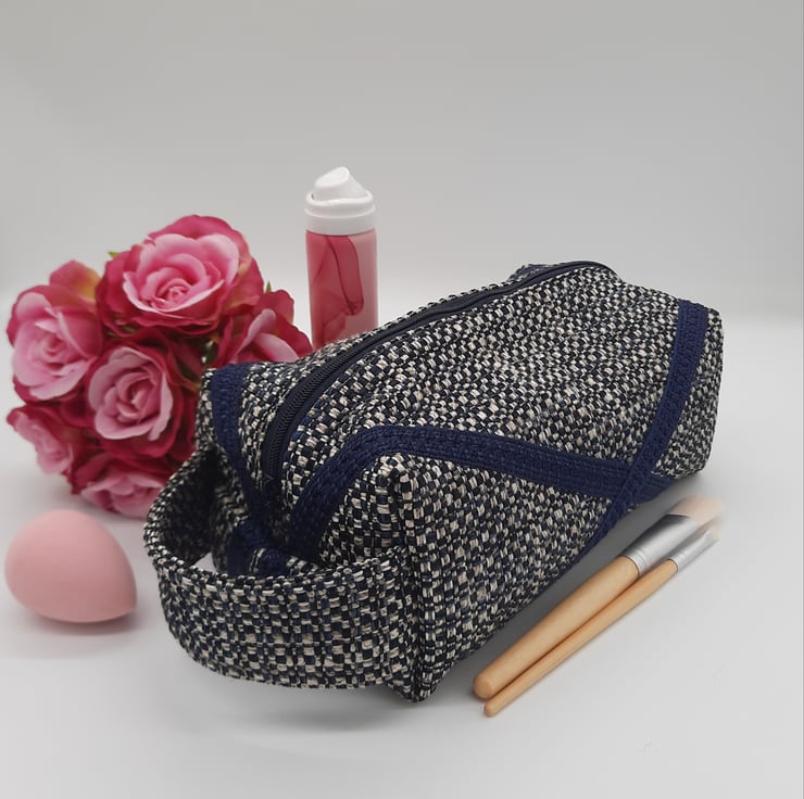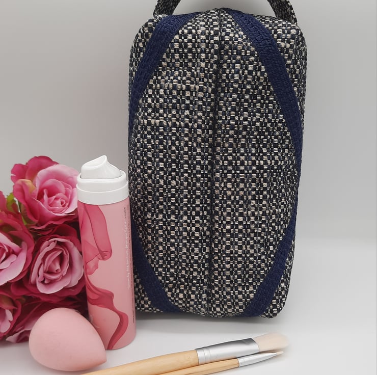 Here we have a navy blue themed boxed toiletry makeup bag.