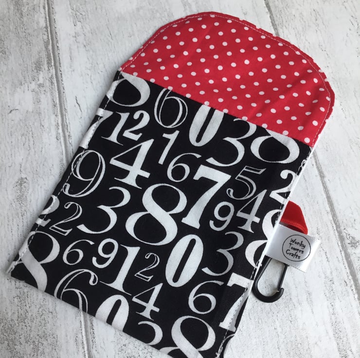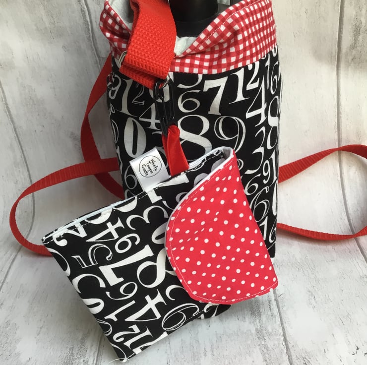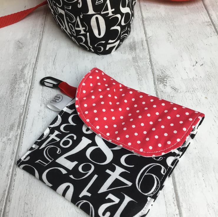 This treat pouch is made from black fabric decorated with white numbers. The flap is red polka dot and the lining is white. The whole thing is washable in the machine or you can just wipe the lining clean. It coordinates with some of our other products and is shown here clipped to one of our water bottle bags.