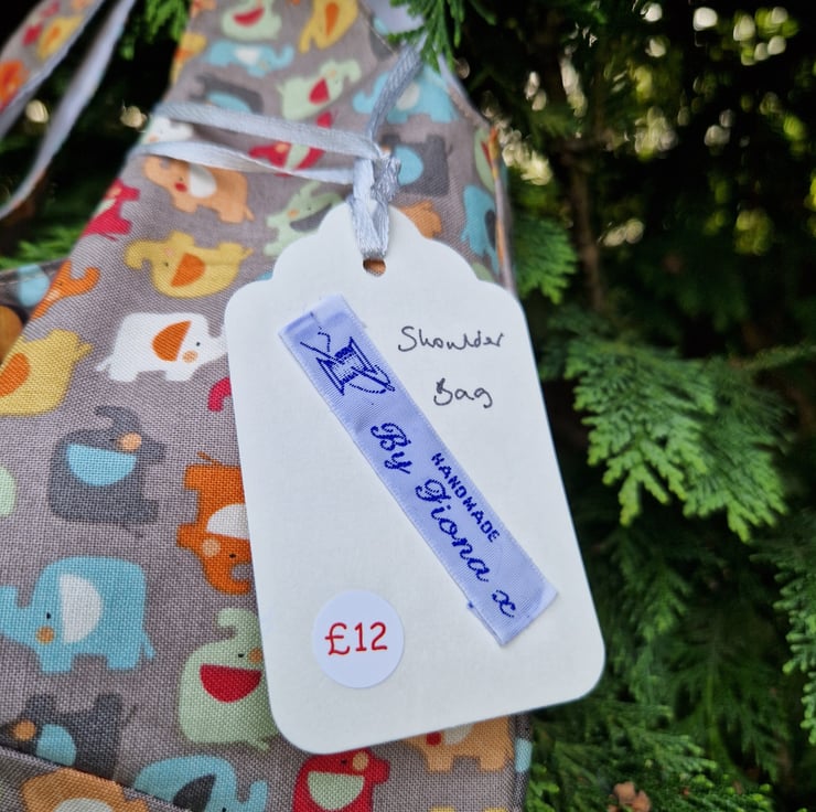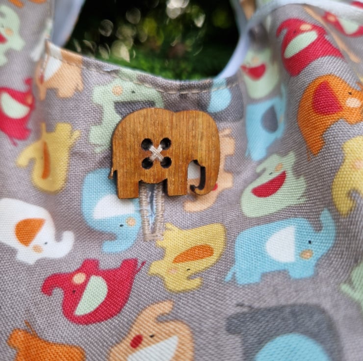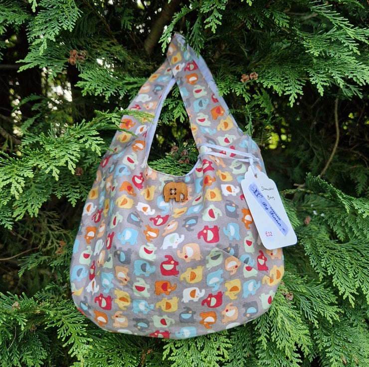 A fully lined shoulder bag. Made from a grey cotton with a print of assorted coloured little elephants with a wooden elephant shaped button.