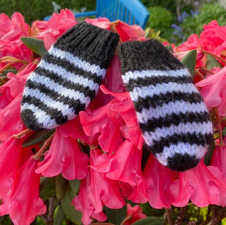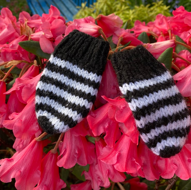 It’s bumblebee season, but I’d run out of yellow yarn. And it struck me, black and white on a baby could be really cute. And it is!