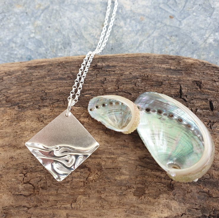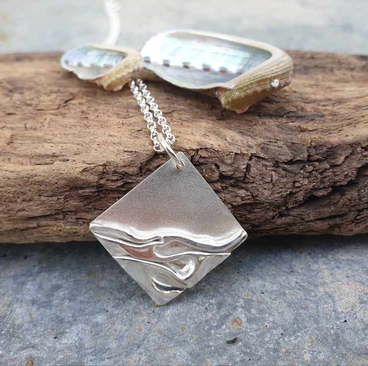 Inspired by my love of the sea, and walks along the shore, this diamond shaped pendant is handmade in sterling silver. It has been textured on one half to look like sand and has a layer of folded fine silver to represent the sea. It measures approx 19mm across and comes complete with a sterling silver belcher chain which fastens with a bolt clasp