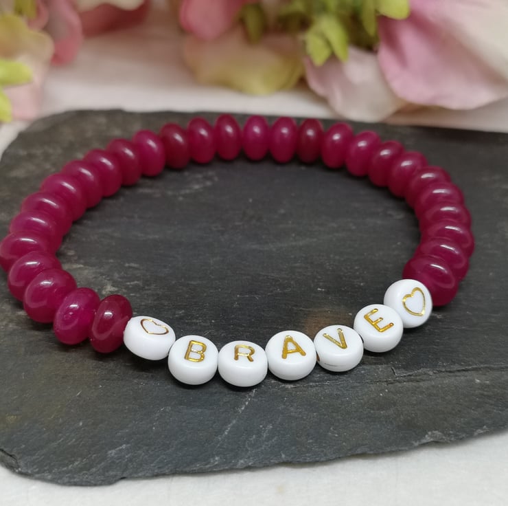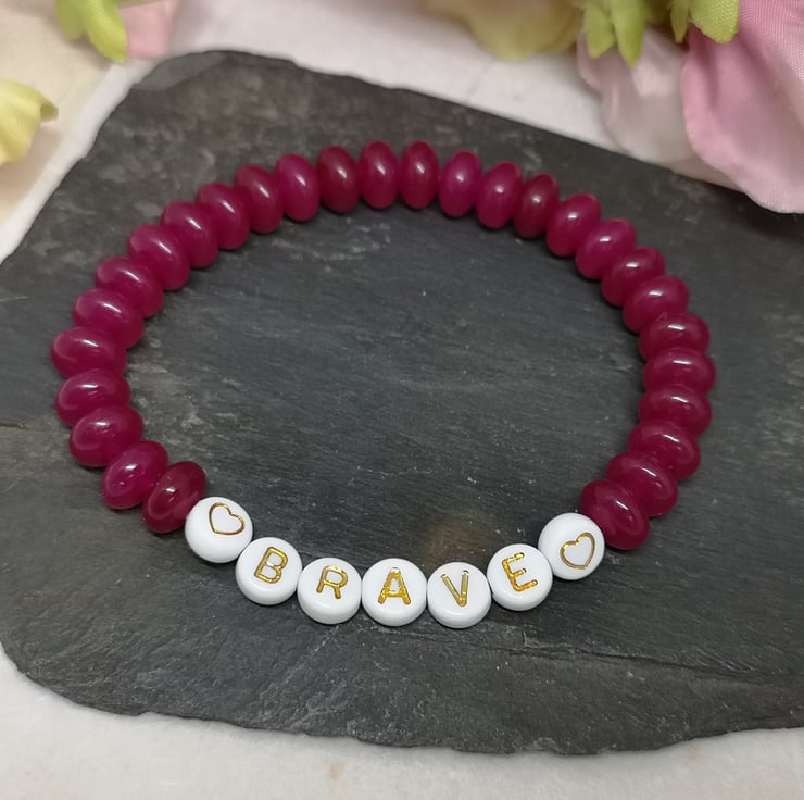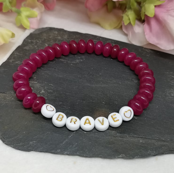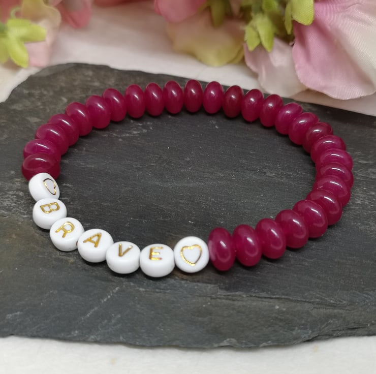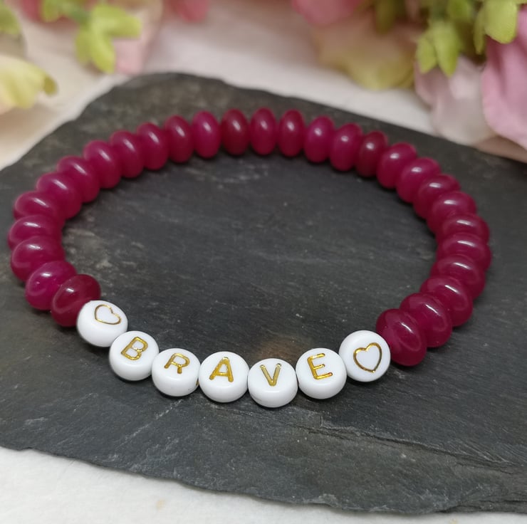 Embrace your inner courage with this stretchy gemstone bracelet. Pink chalcedony is a symbol of strength and resilience and with "brave" on your wrist it's a reminder to live fearlessly.