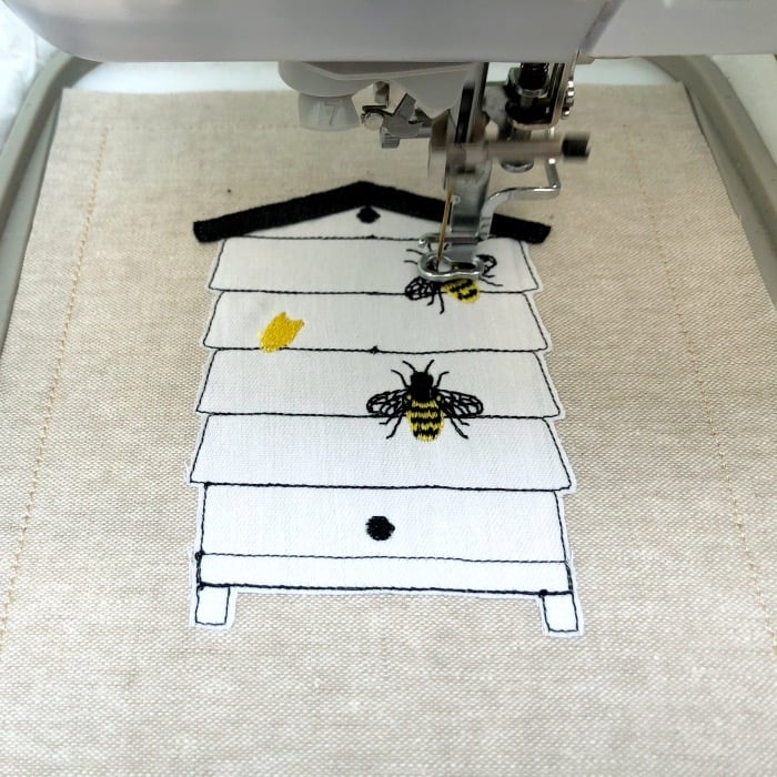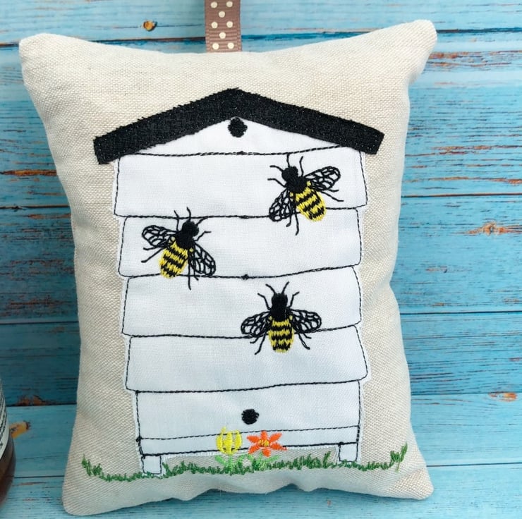 The Beehive Lavender bag has embroidered Bees on a Raw Edge Appliqued Traditional Beehive