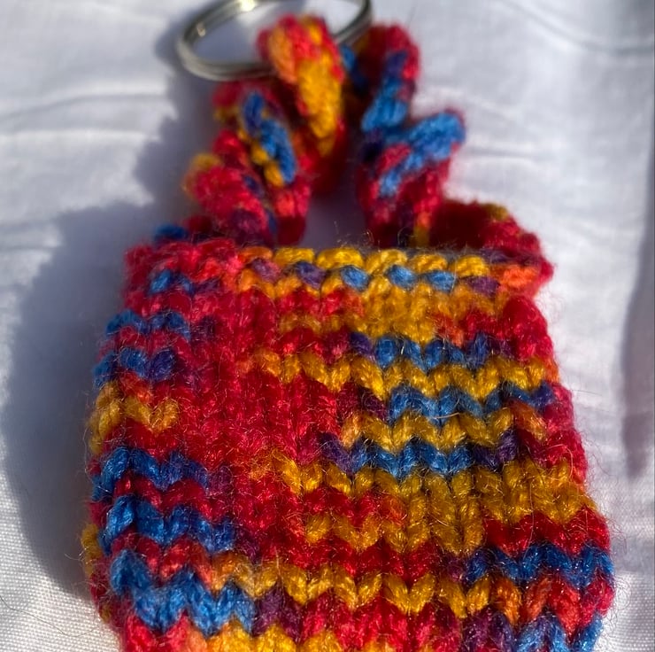This little keyring bag brought itself to life. I was short on inspiration, cast on some yarn, and this was the result.