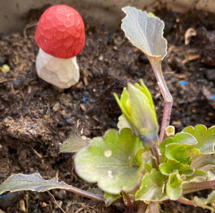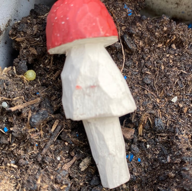 Hand carved and painted staked wooden mushroom plant pot ornament.