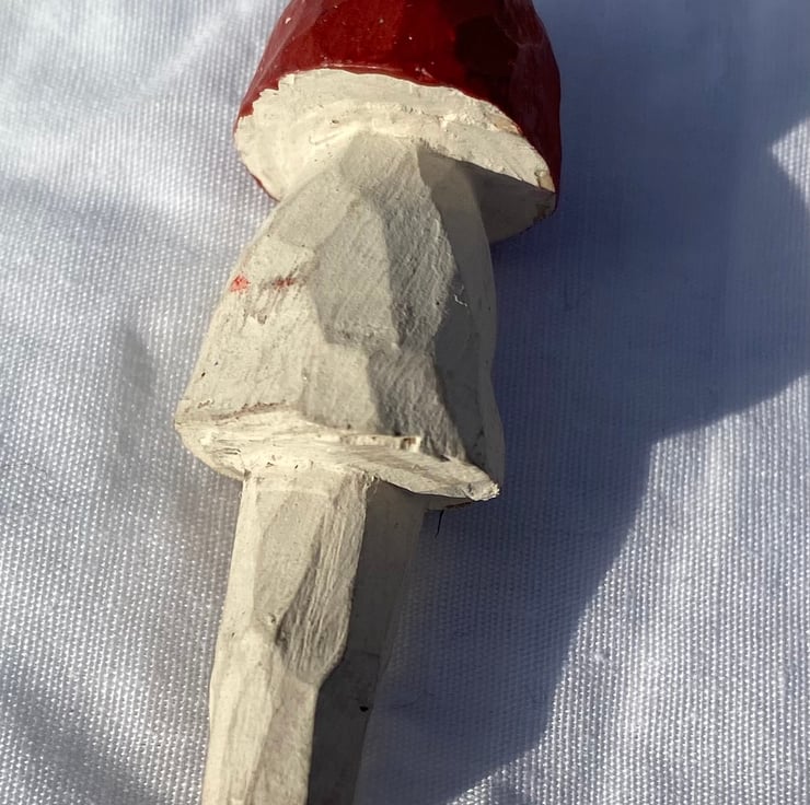 Made using locally sourced wood which had naturally fallen in Aberdeen, by the banks of the picturesque River Dee, this little toadstool was painstakingly whittled and decorated by the Caca in CacaSqueaky, a teenage boy with a passion for woodwork and nature.