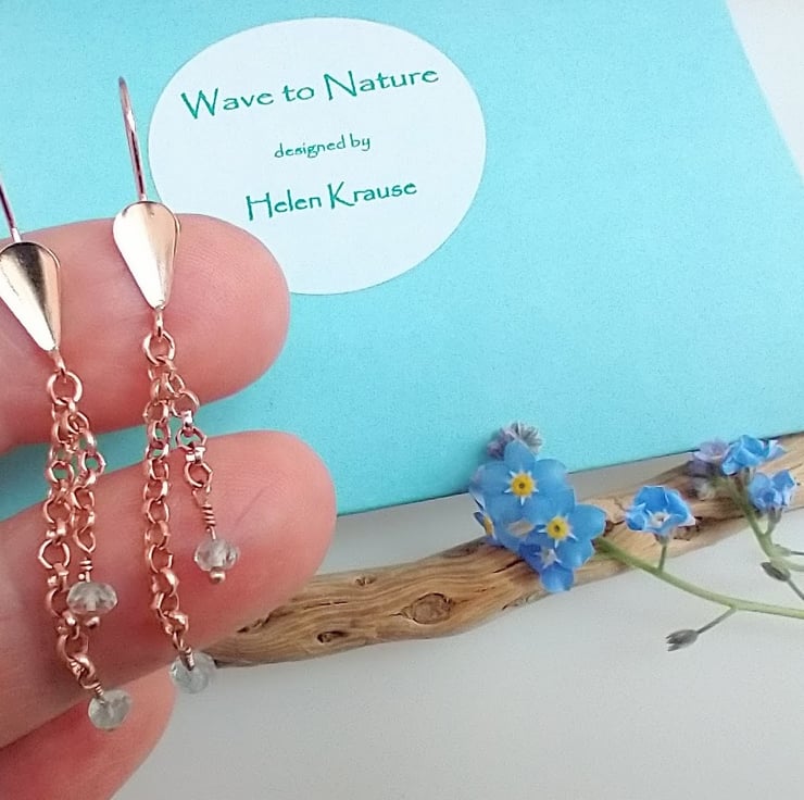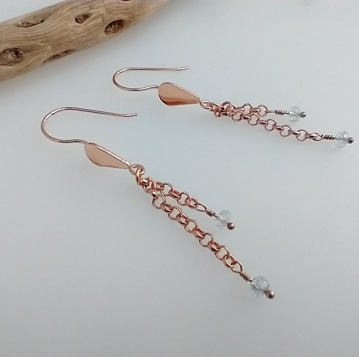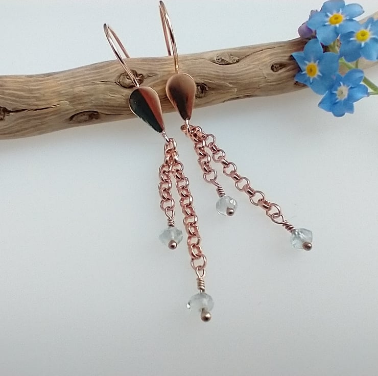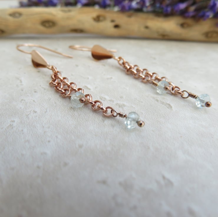 The warm tones of rose gold with aquamarine go so well together. These look really pretty with lots of movement and the dangly chains and faceted gemstones catch the sunlight as they move.