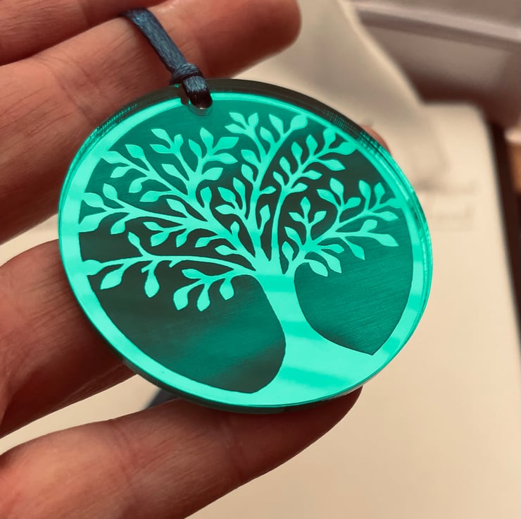 A sparkly laser-etched tree of life decoration. The original design is reverse-etched into the mirrored acrylic so that it catches the light and reflects the colours and lights around it.