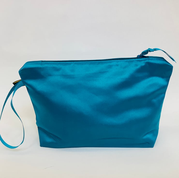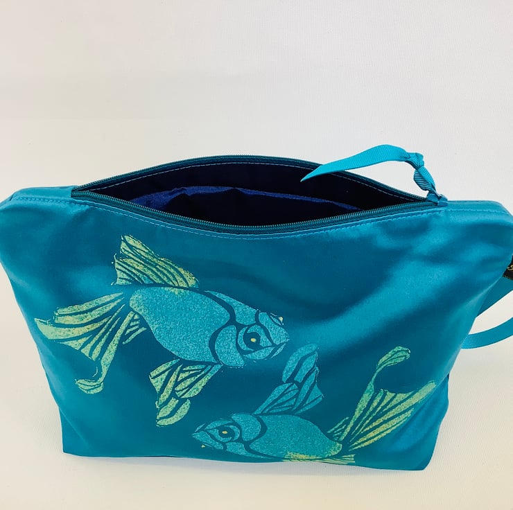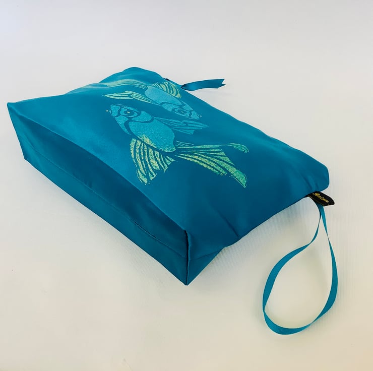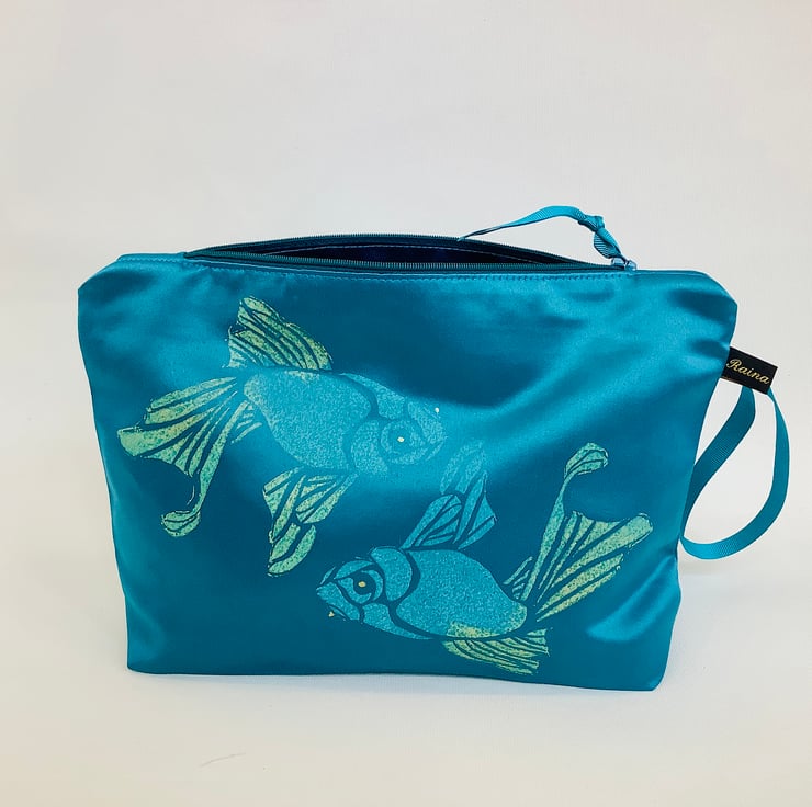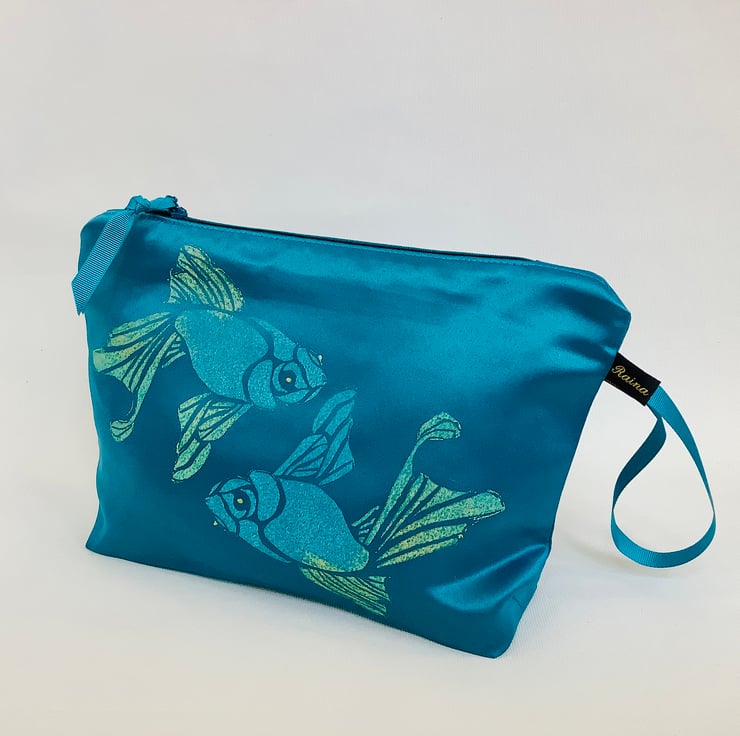 Stylish hand printed pouches featuring Koi Fish design on the front, made in luxurious Duchess Satin are perfect for keeping all your daily essentials like makeup, sunglasses, phone etc safely stored in one place. They are your new everyday essential, perfectly sized to fit in your handbag or suitcase. This size makeup bag can also be used as a clutch.