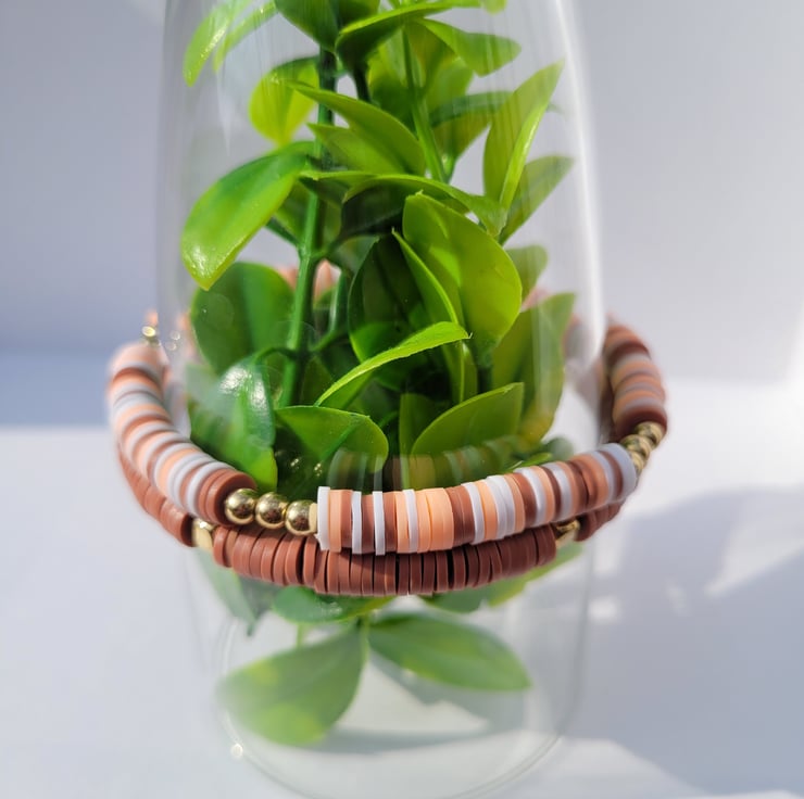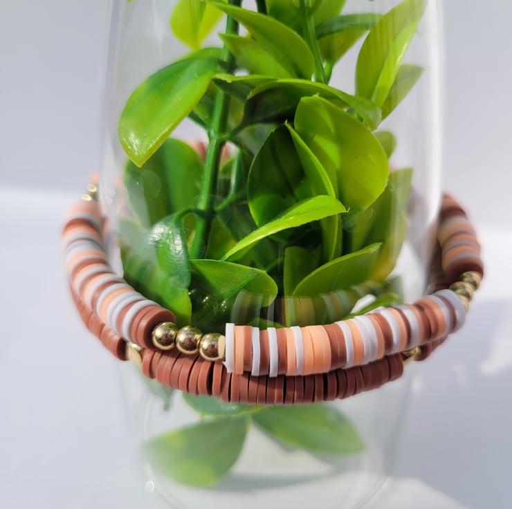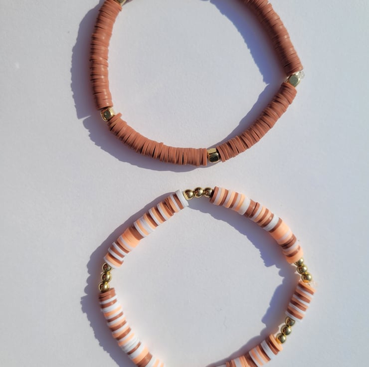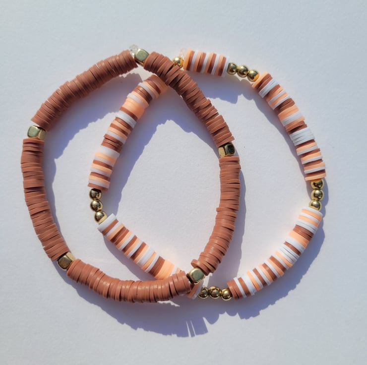 2x polymer clay flat bead bracelets in a tan, white and peach colour scheme. Made with clear jewellery elastic, and gold spacer beads