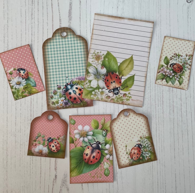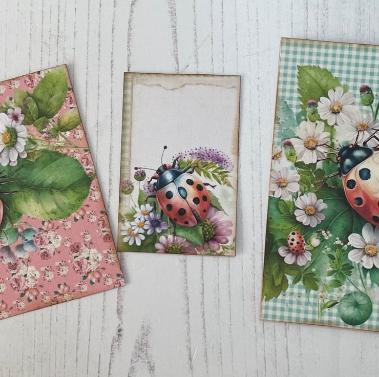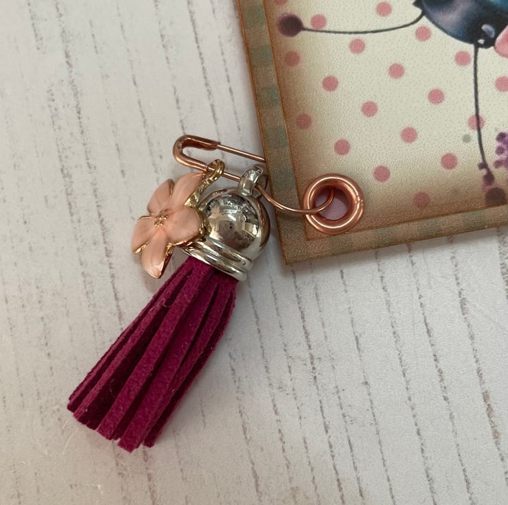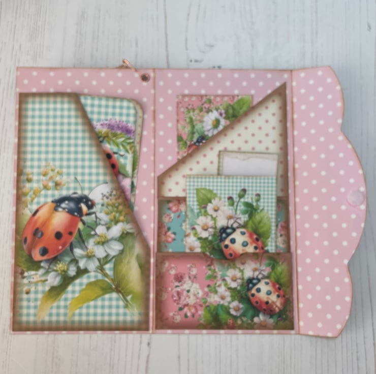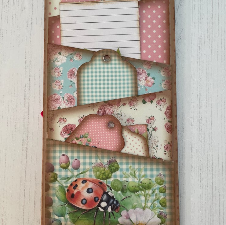The ladybird is the theme for this folio with plenty of flowers. Measuring 7.5” x 4”. 8 pockets with 12 tags and journal cards. Embellished with paper flowers and a charm word ‘ Dream’, cerise now. Bulb pin dangle with a burgundy tassel and flower charm.