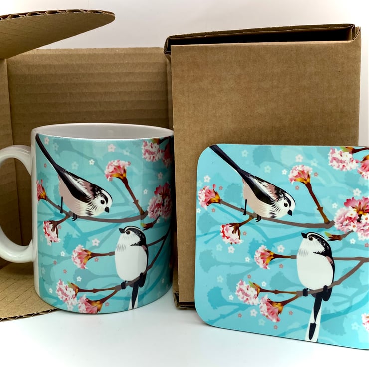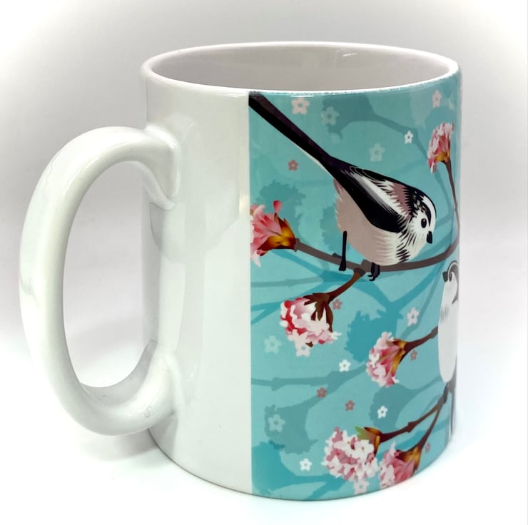 Pair of fluffy little Long Tailed Tits perched on a sweet smelling Winter Viburnum branch featured on this chunky 10oz Ceramic Mug with a matching square Hardback Eco Coaster (see options).