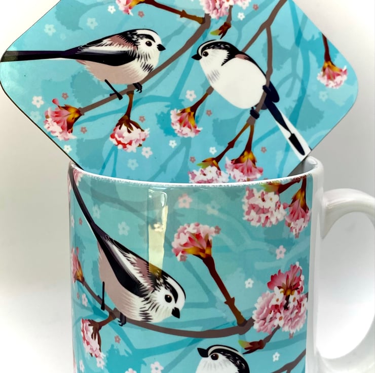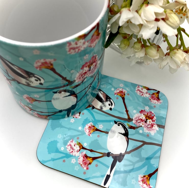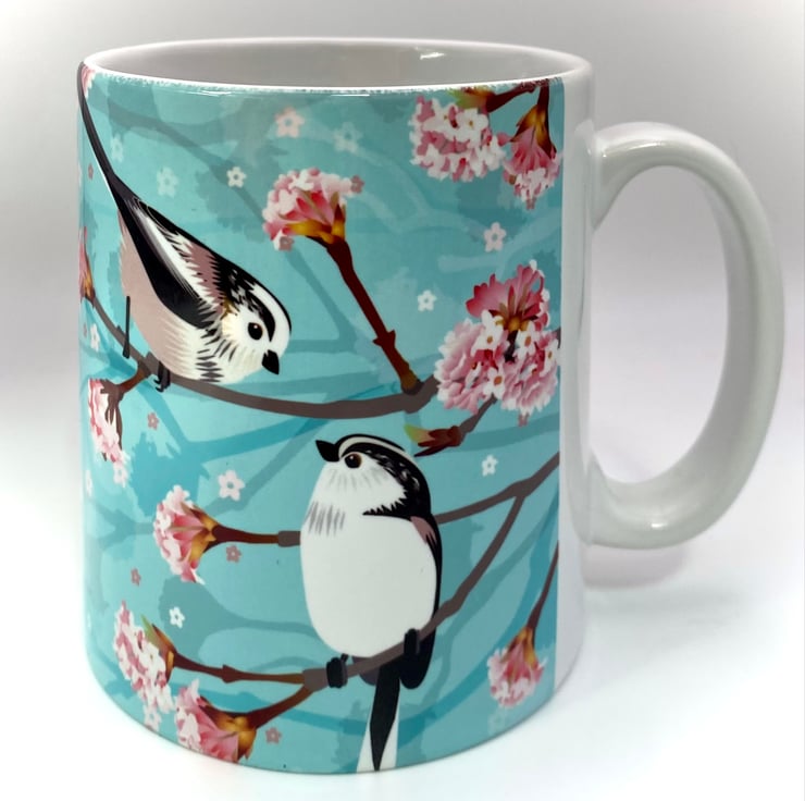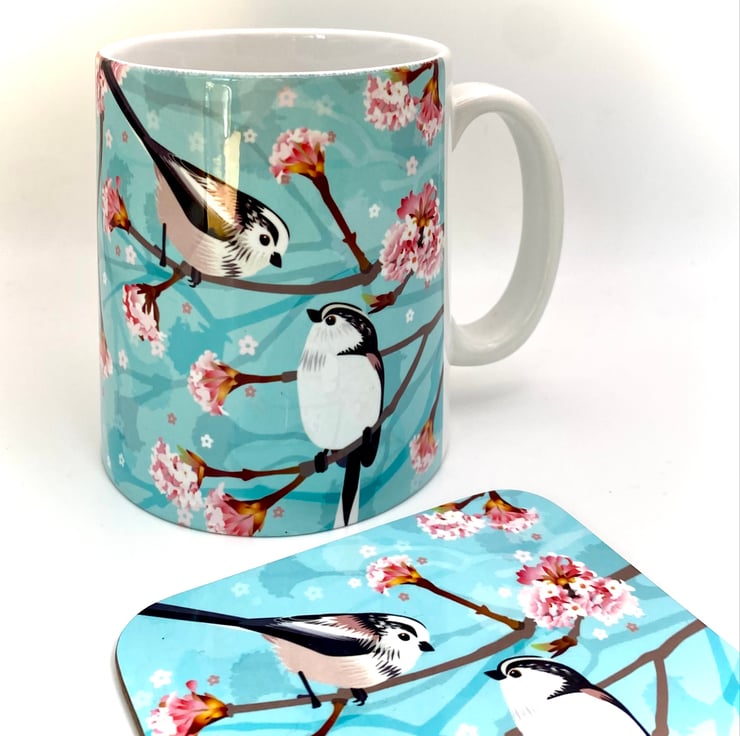 Pair of fluffy little Long Tailed Tits perched on a sweet smelling Winter Viburnum branch featured on this chunky 10oz Ceramic Mug with a matching square Hardback Eco Coaster (see options).