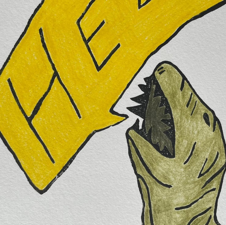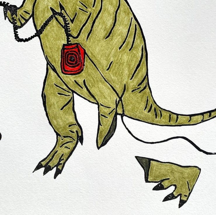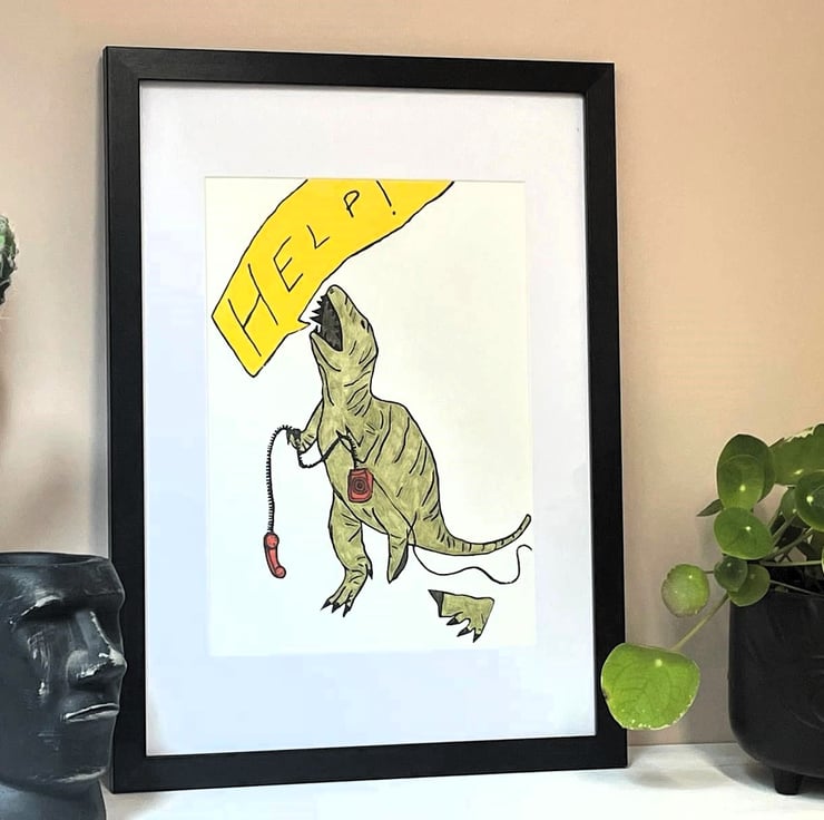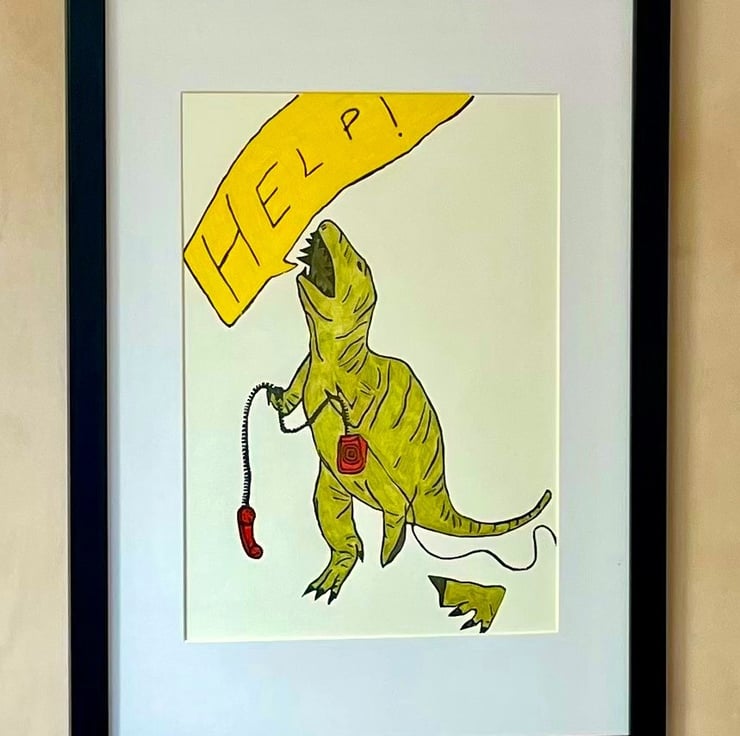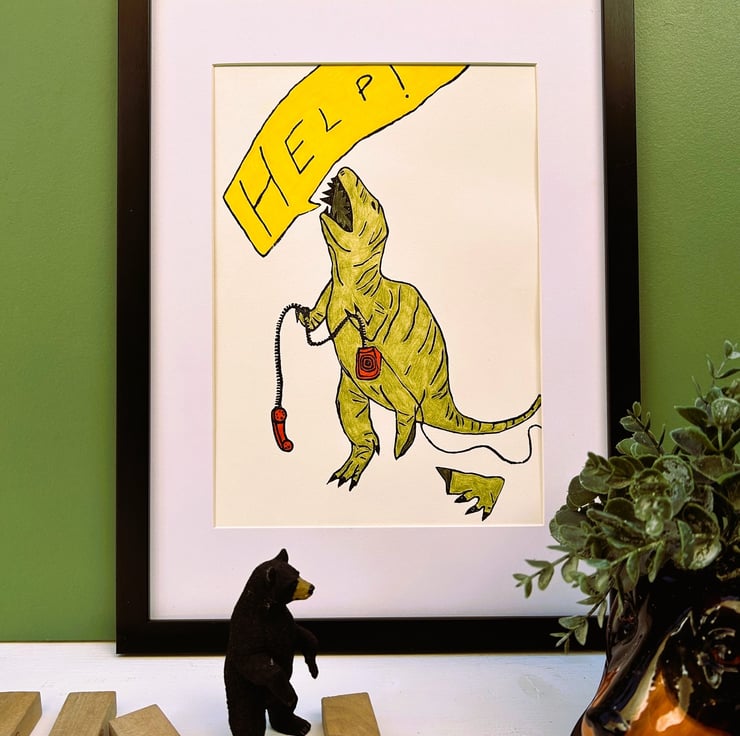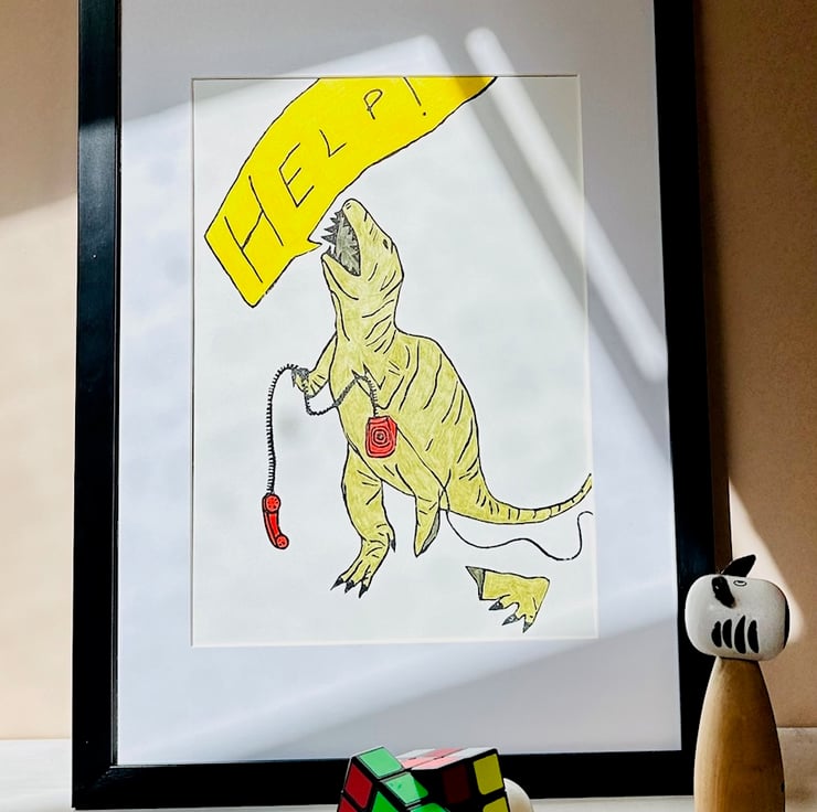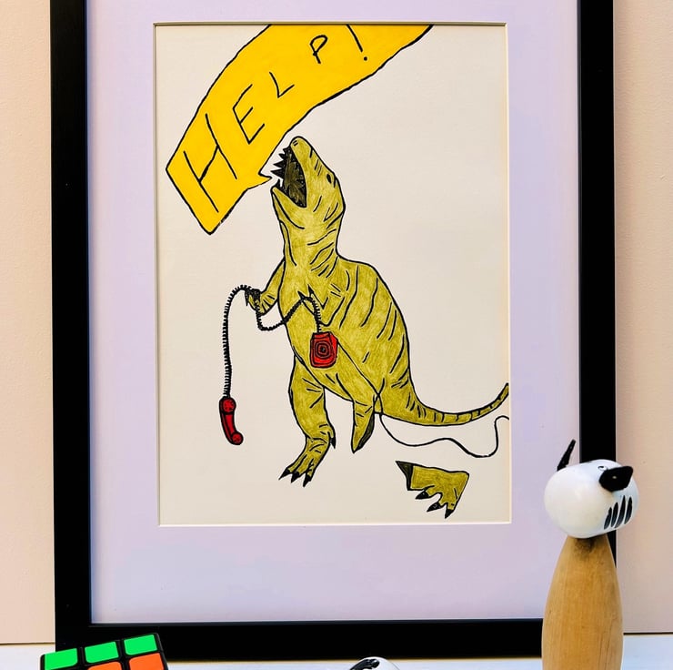 T- Rex print, which is made through a lino cut process then coloured using pencil. This series of ongoing prints is inspired by a broken toy dinosaur that I found. Each one shows how the dinosaur is coping with the ridiculous situation he has found himself in.