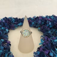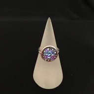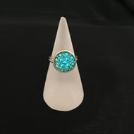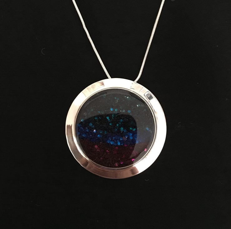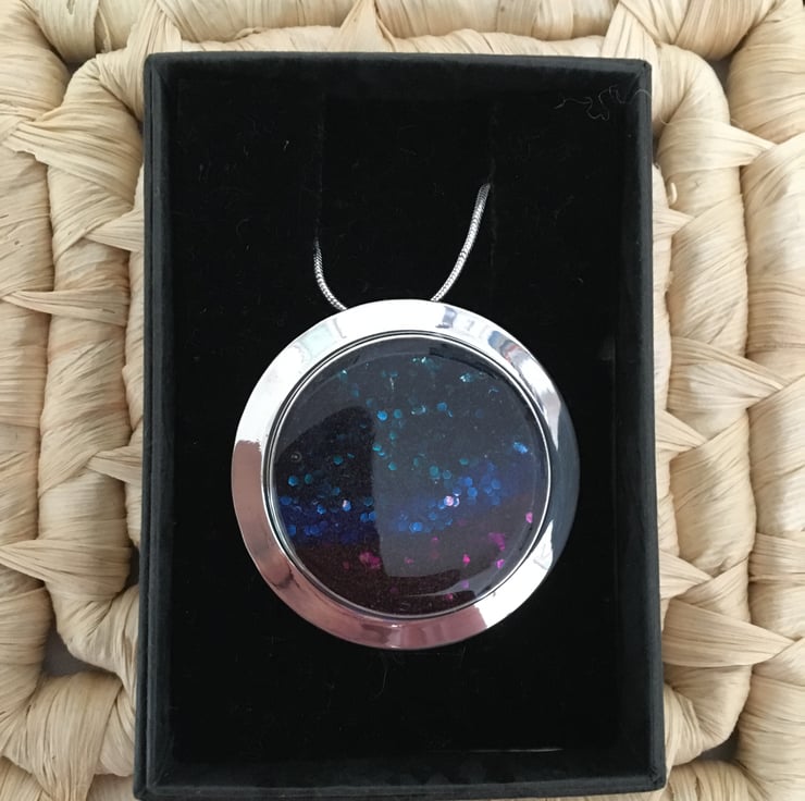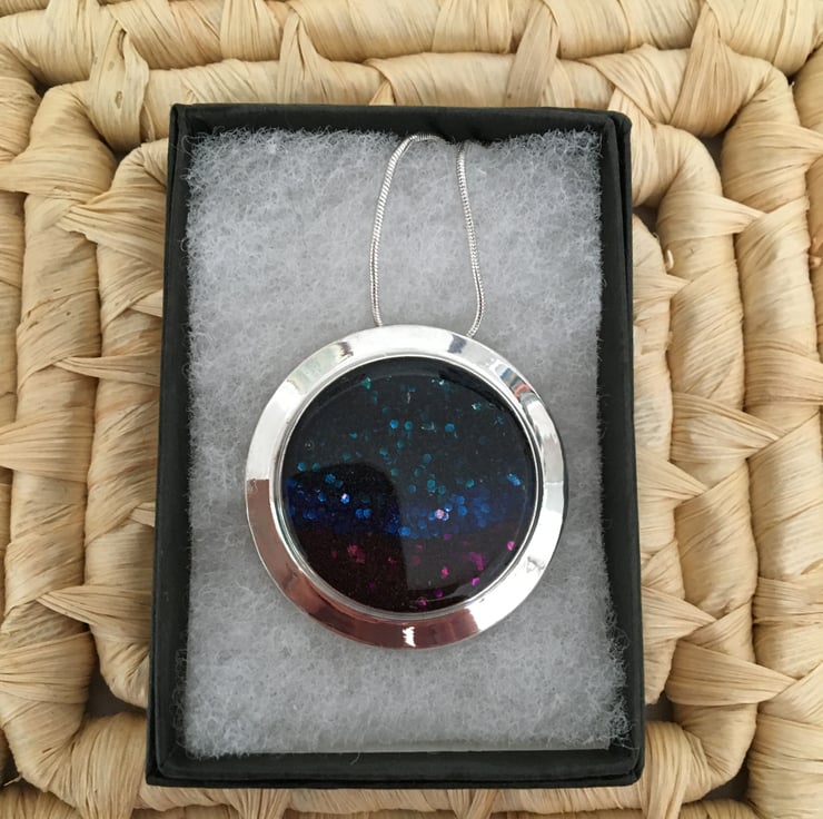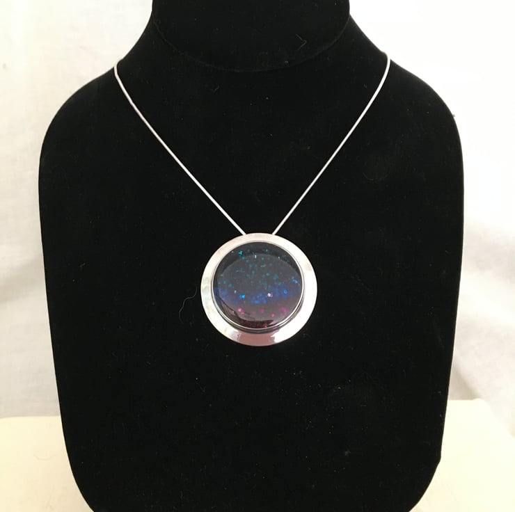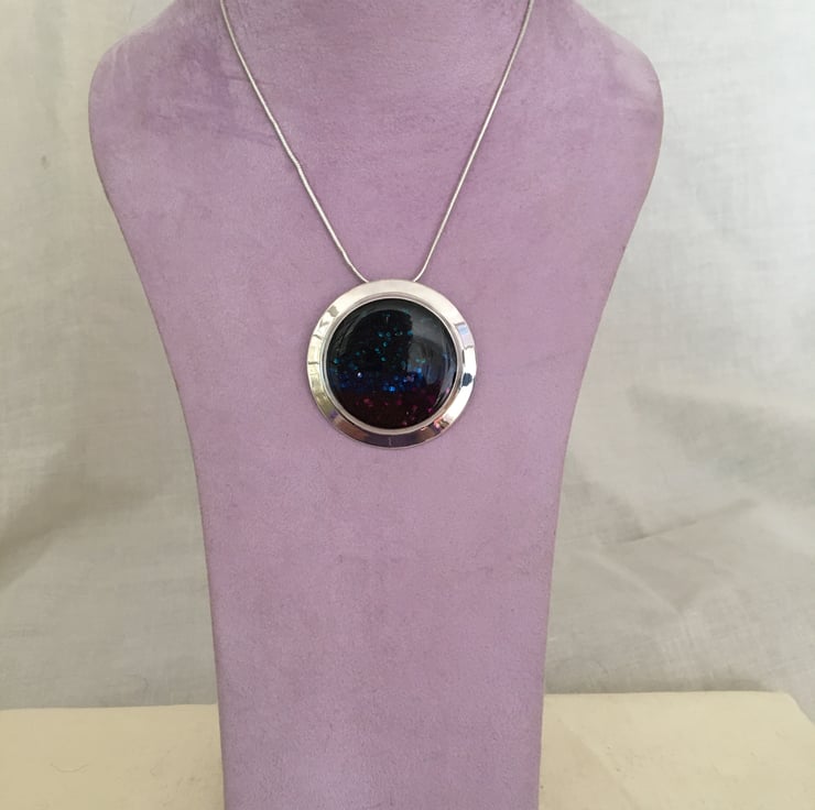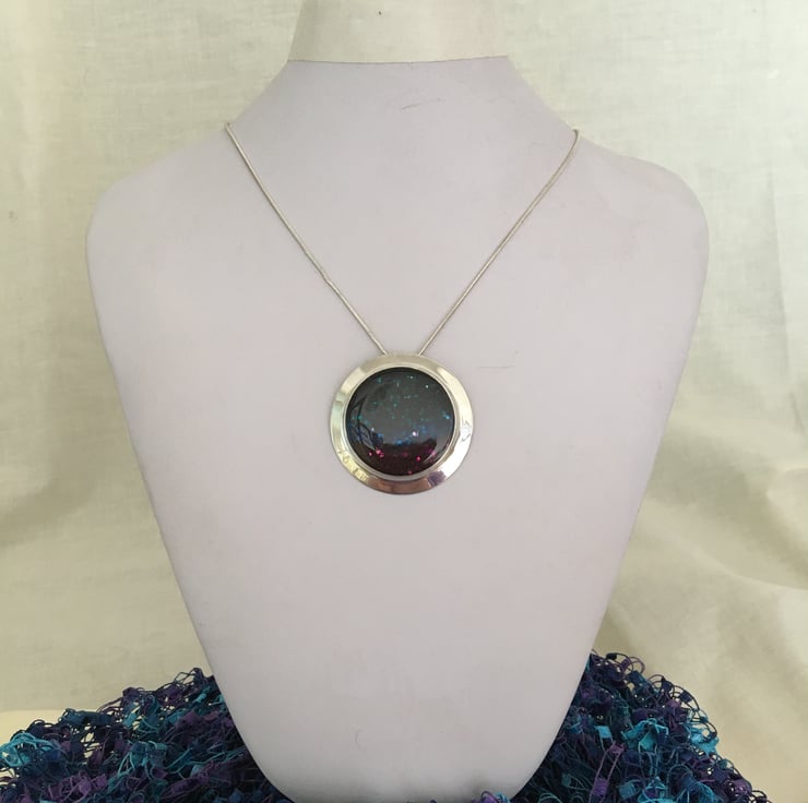 The centrepiece is created using a tri-colour base with a 2 part resin mix overlay in a quality silver tone setting. The colours are a deep mix of green, blue and wine, they reflect the light and can be worn as day or evening wear.