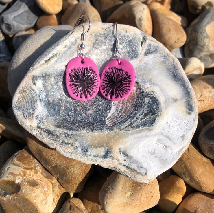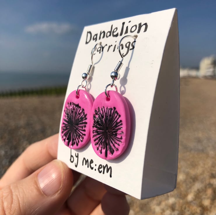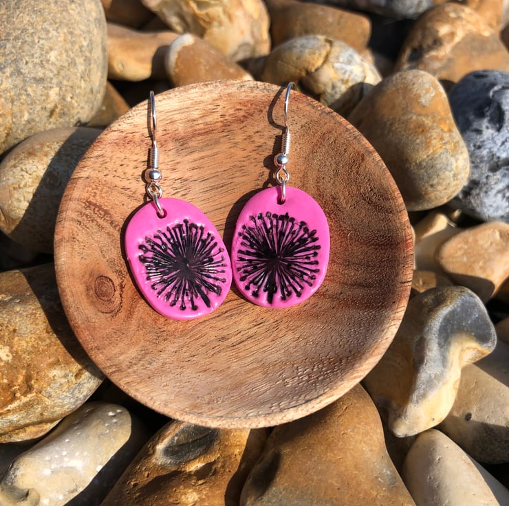 These silver plated earrings are made from polymer clay, inscribed with a dandelion clock design and varnished for extra durability and shine.