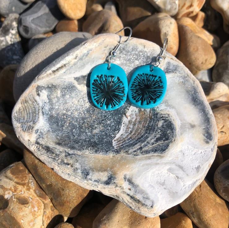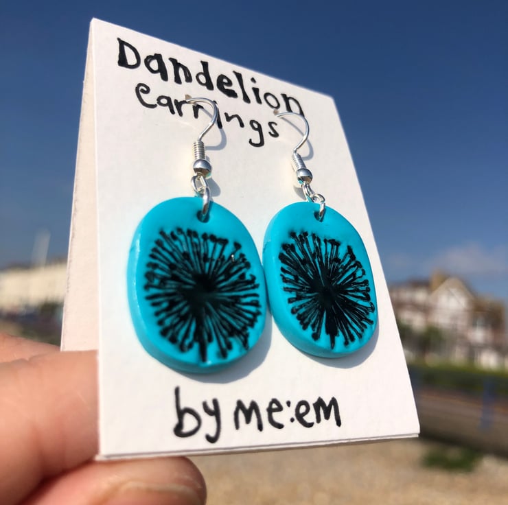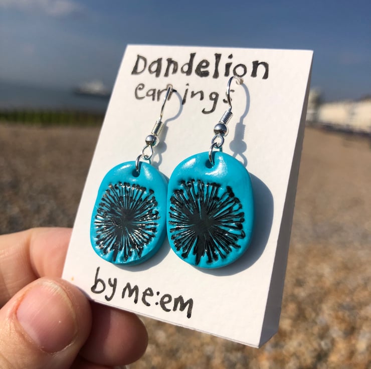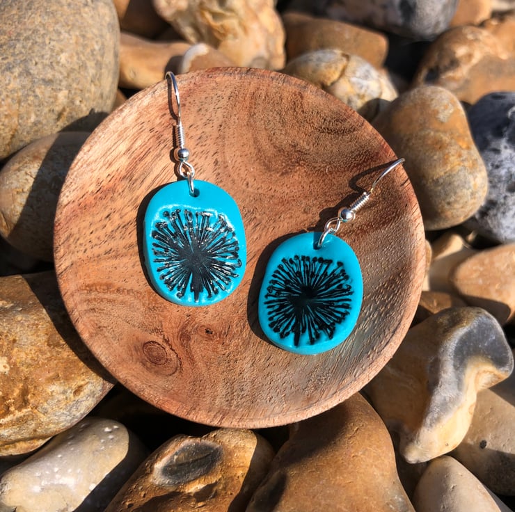 These silver plated earrings are made from polymer clay, inscribed with a dandelion clock design and varnished for extra durability and shine.