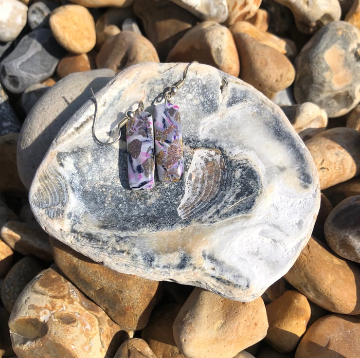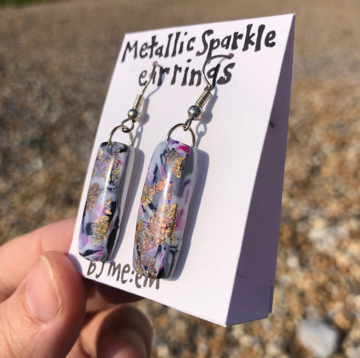 These silver plated earrings are made from a mixed grey, purple, pink, black and white polymer clay. They have metallic flecks of gold and copper embossed into them to give an extra bit of sparkle.