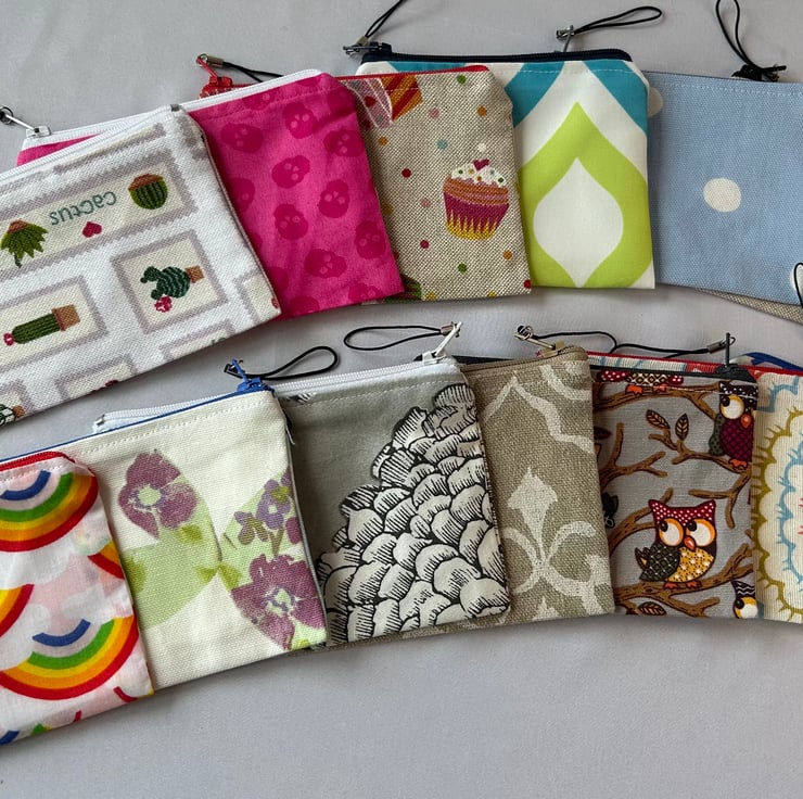 The inside of the purse/pouch is fully lined and comes with a zip closer to keep item’s safe inside. Each fabric has different prints on them one of each design, cow, rainbow, owl, spots, cactus, skull, cupcakes, heart shape, flower pattern, silver flower, beige linen and butterfly’s.