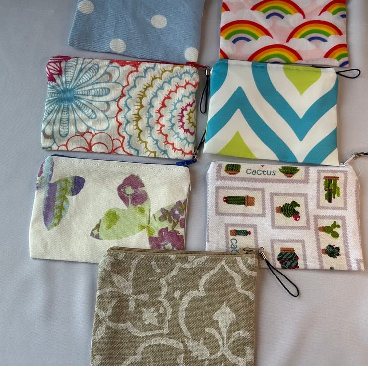 The small purse/pouch is made with different fabrics and come in different sizes, very versatile use. come in different fabrics, cotton, linen, polyester, poly cotton. Sizes are 5.5inch x 4 3/4inch, 9.5cm x 14cm, and 5inch x 3.5inch, 12.5cm x 9cm.