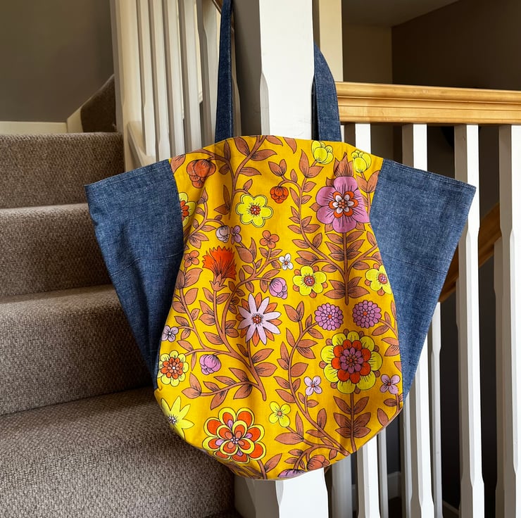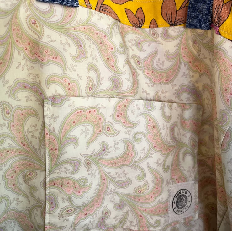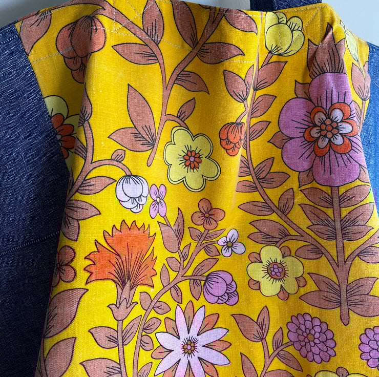 Big, strong tote bag in stunning Jonelle Roundelay cotton with a bold retro floral design. It is teamed with reclaimed curtain fabric with a denim look. The bag is fully lined with pretty Moda paisley cotton and there is a matching patch pocket inside. The shoulder straps are made from reclaimed denim effect fabric too. This bag is one of a kind.
