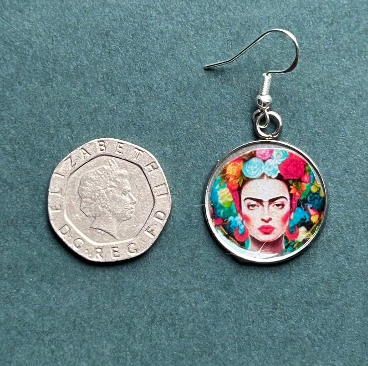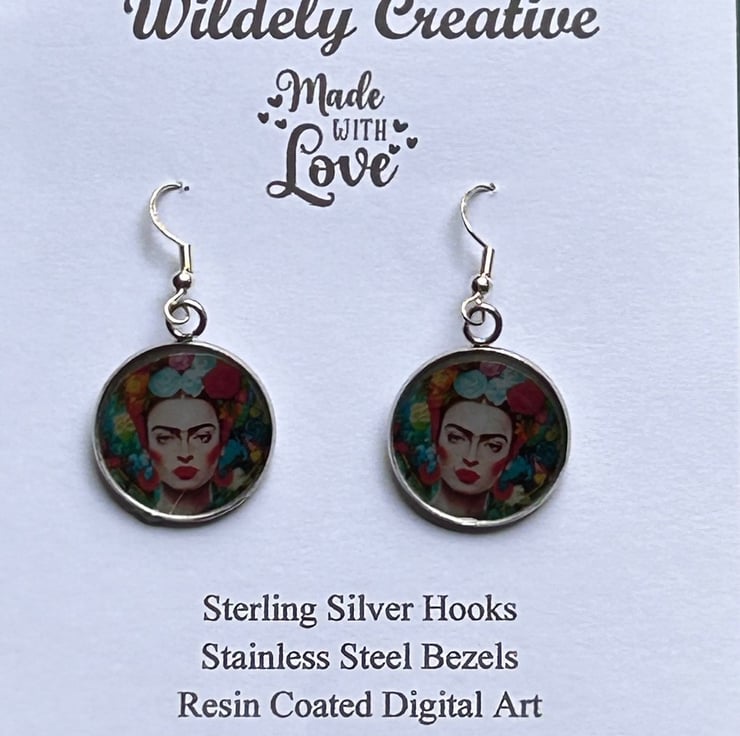 The digital art is set in a 2cm stainless steel bezel tray sealed with epoxy resin. The ear hooks are 925 stamped sterling silver.