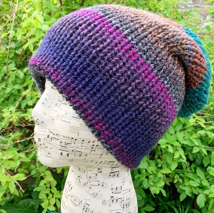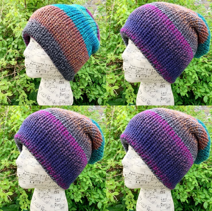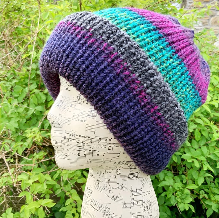 A very cosy hat that would be perfect for winter as it's so thick and warm. It has been knitted in a very soft chunky yarn, with multicoloured shades on both sides (100% Acrylic).