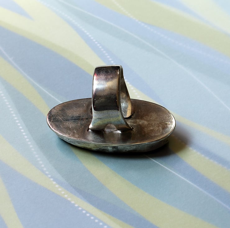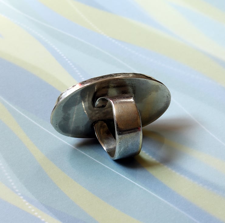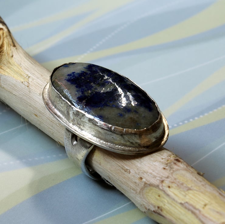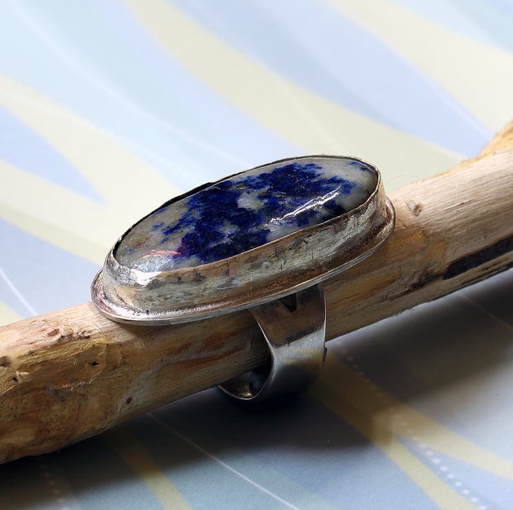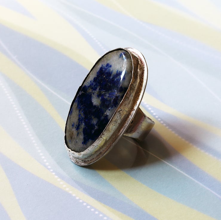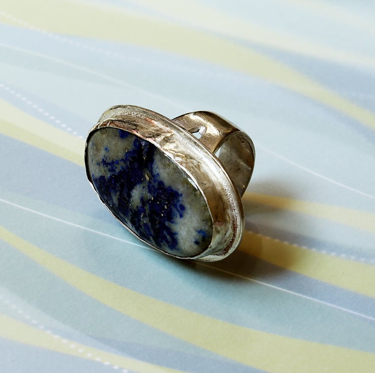 Quite a statement of a ring !. The stone featured is a Lapis Lazuli of rich blue and cloudy white colours. The stone is quite large, measuring 37mm long by 20mm and is stylishly framed by 5mm of shiny silver around it. The band of the actual ring is 8mm wide and is size N (UK). This is a handmade, one-off unique piece of jewellery. It weighs 23gm.