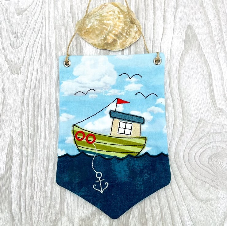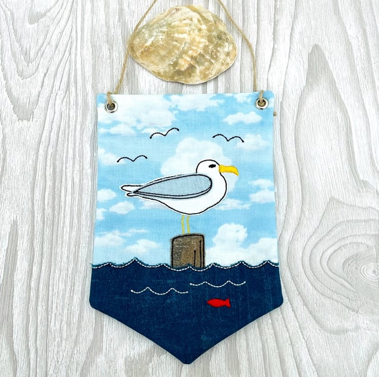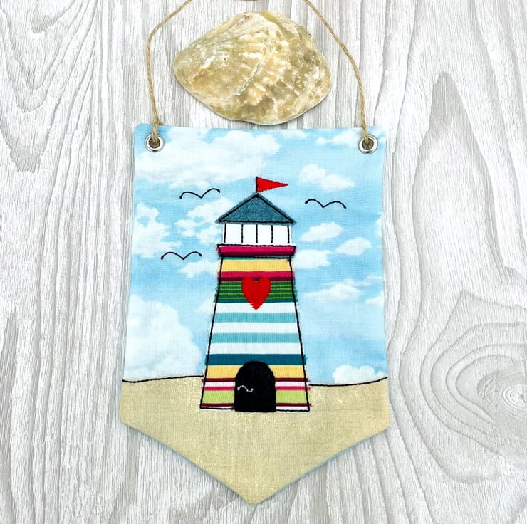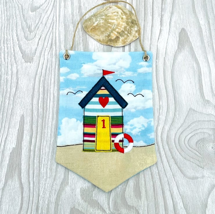 Made from 100% Cotton fabric with Appliqued and Embroidered Beach Scene design to the front. Backed in a contrast 100% cotton fabric and finished off with a natural Jute cord for hanging.