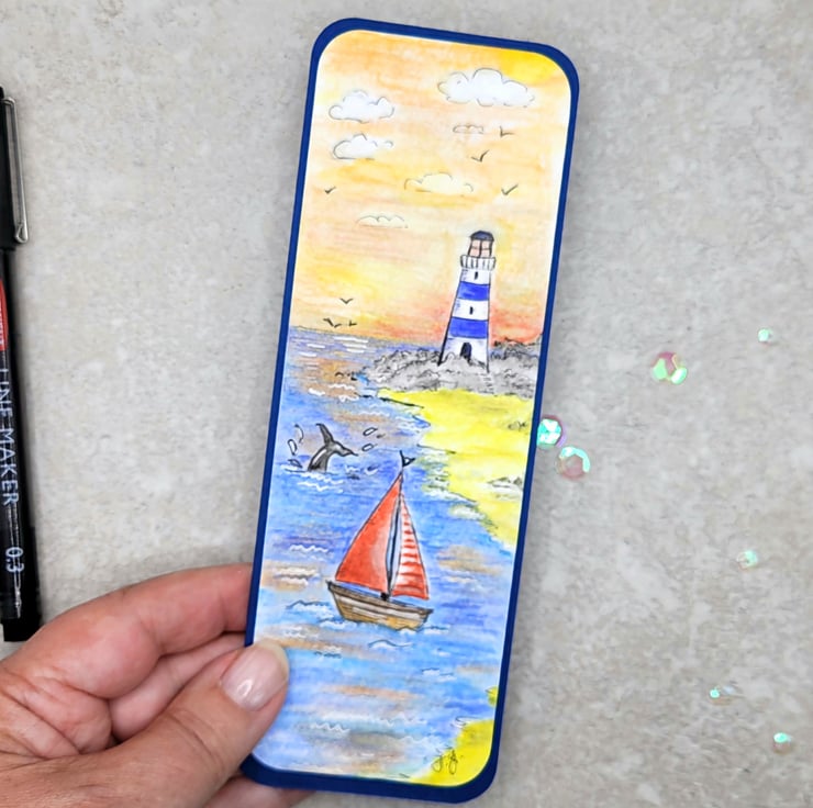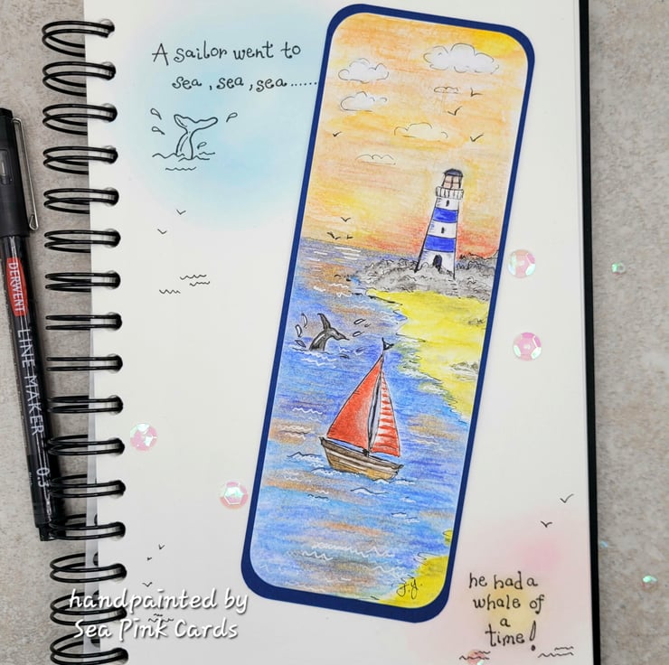 A handpainted bookmark, with a fun sailing theme. This one-of-a-kind bookmark has been drawn and painted by hand in my craftroom, using my own original design. Measuring 6.5 x 18.5 cms, it is painted on heavyweight 300gsm watercolour card, which I have backed with thick 270gms co-ordinating coloured card. This makes the bookmark sturdy and durable.