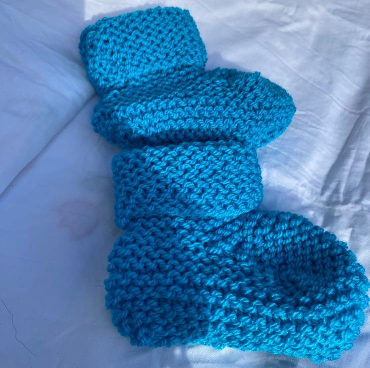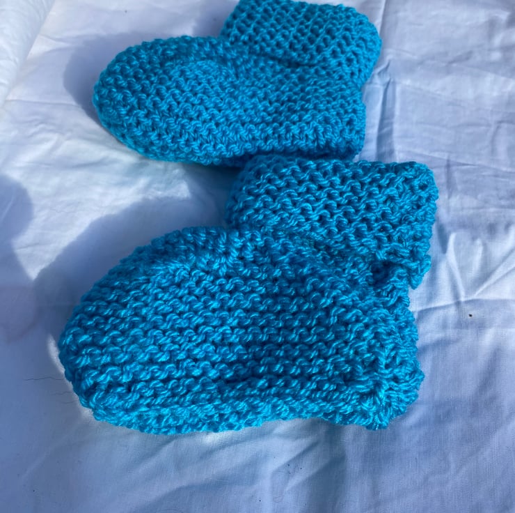 This pair of turquoise handknitted baby booties is perfect for the little boy or girl in your life, and makes a fantastic new baby gift, or baby shower gift.