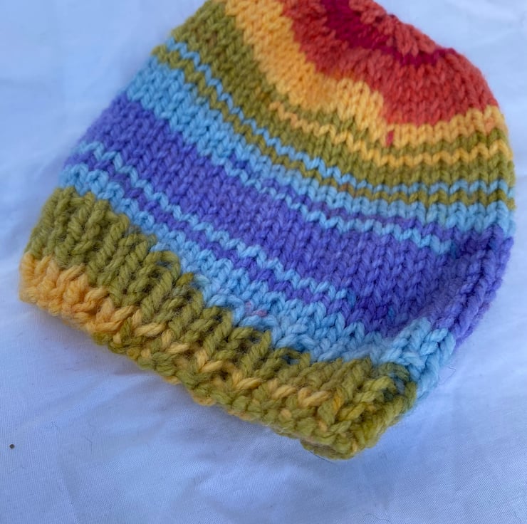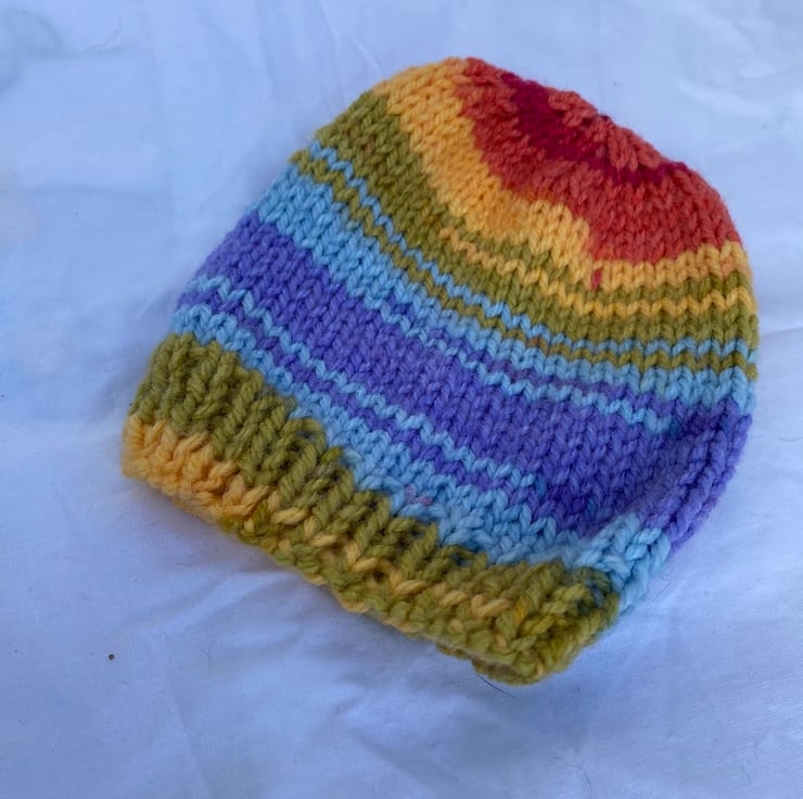 This colourful little hat has been handknitted in soft, easywash acrylic yarn suitable for delicate baby skin.