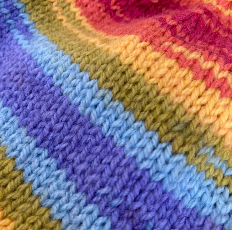 This little hat came to life during a family holiday in Nairn, on the Moray Firth. During a couple of days of wild, wet, and windy weather I found myself venturing into the wool shop looking for something to do, and my eye was almost immediately drawn to this bright yarn, which made a refreshing change from the dreich weather.