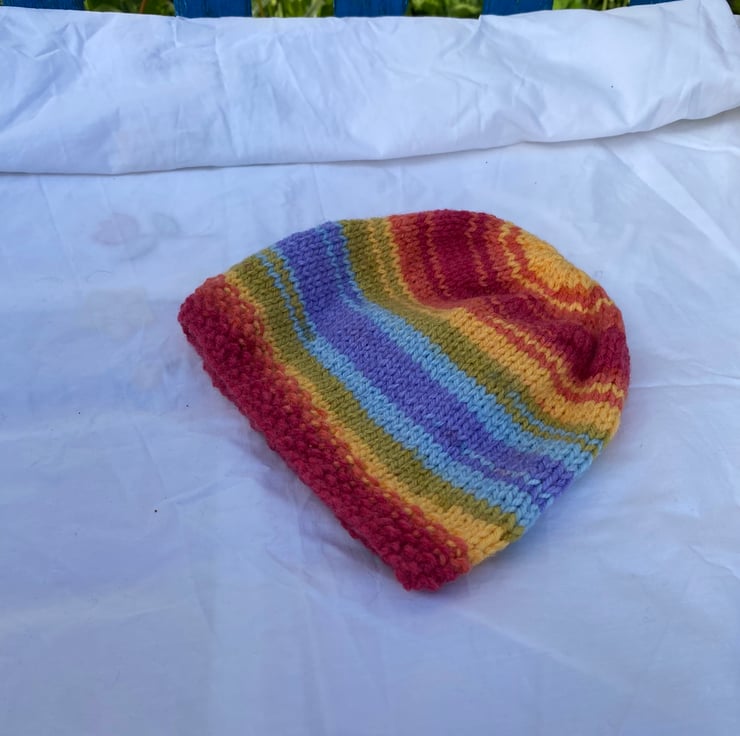 This colourful little hat has been handknitted in soft, easywash acrylic yarn suitable for delicate young skin.